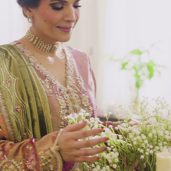 Aaidah is a stunning embodiment of elegance and luxury. The satin zari fabric shirt is beautifully enhanced with intricate embroidery and embellishments, offering a refined and regal look. Paired with rich jamawar trousers and a delicate zari tissue dupatta, this ensemble perfectly balances sophistication and charm. Designed for those who appreciate timeless beauty, Aaidah is a statement of grace and style.