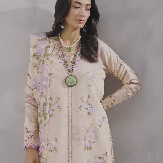Abeera — earthy tones, elevated elegance. In a warm mocha hue, Abeera brings understated sophistication to your summer wardrobe. Featuring intricate embroidery on airy lawn fabric, it's paired with a beautiful dyed nylon viscos dupatta adorned with a graceful border — a perfect balance of depth, texture, and timeless charm.