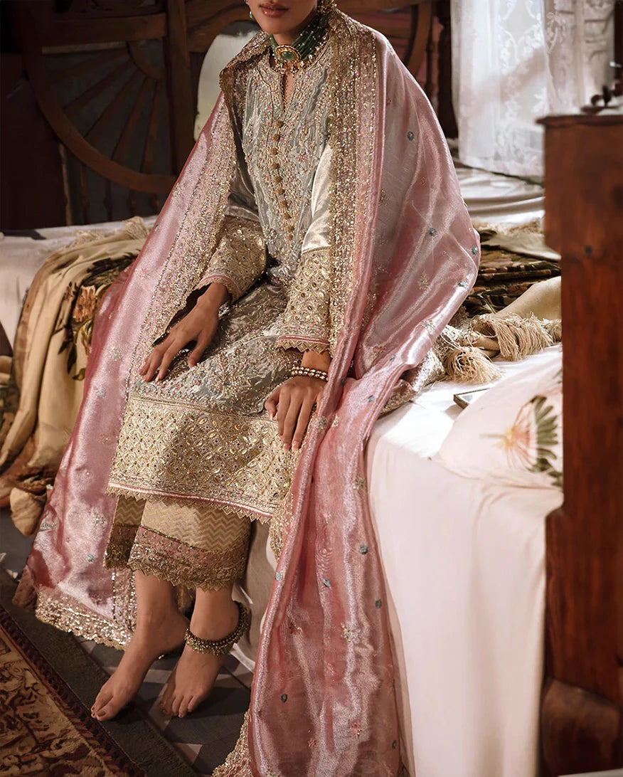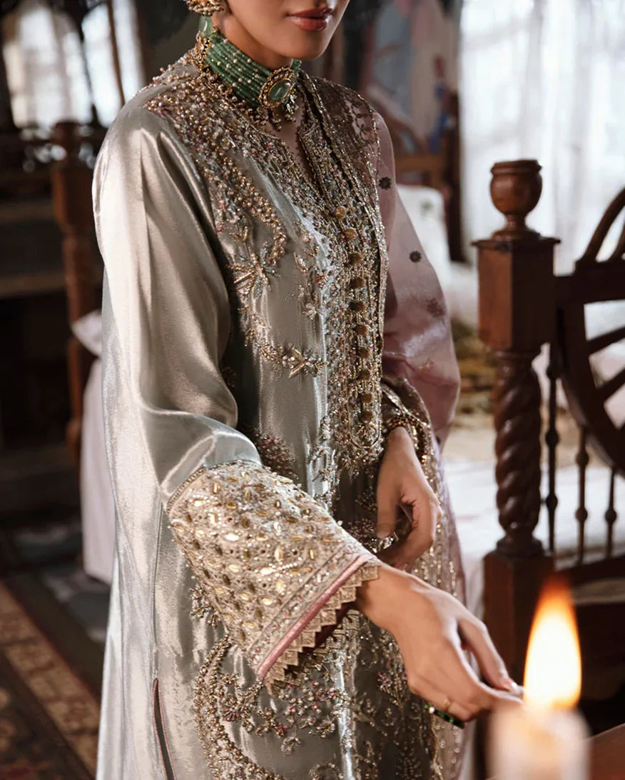 Elevate your style quotient with our silk ensemble featuring hand-embellished details. The meticulous craftsmanship reveals an interplay of sequins, pearls, and metallic accents, illuminating every movement.