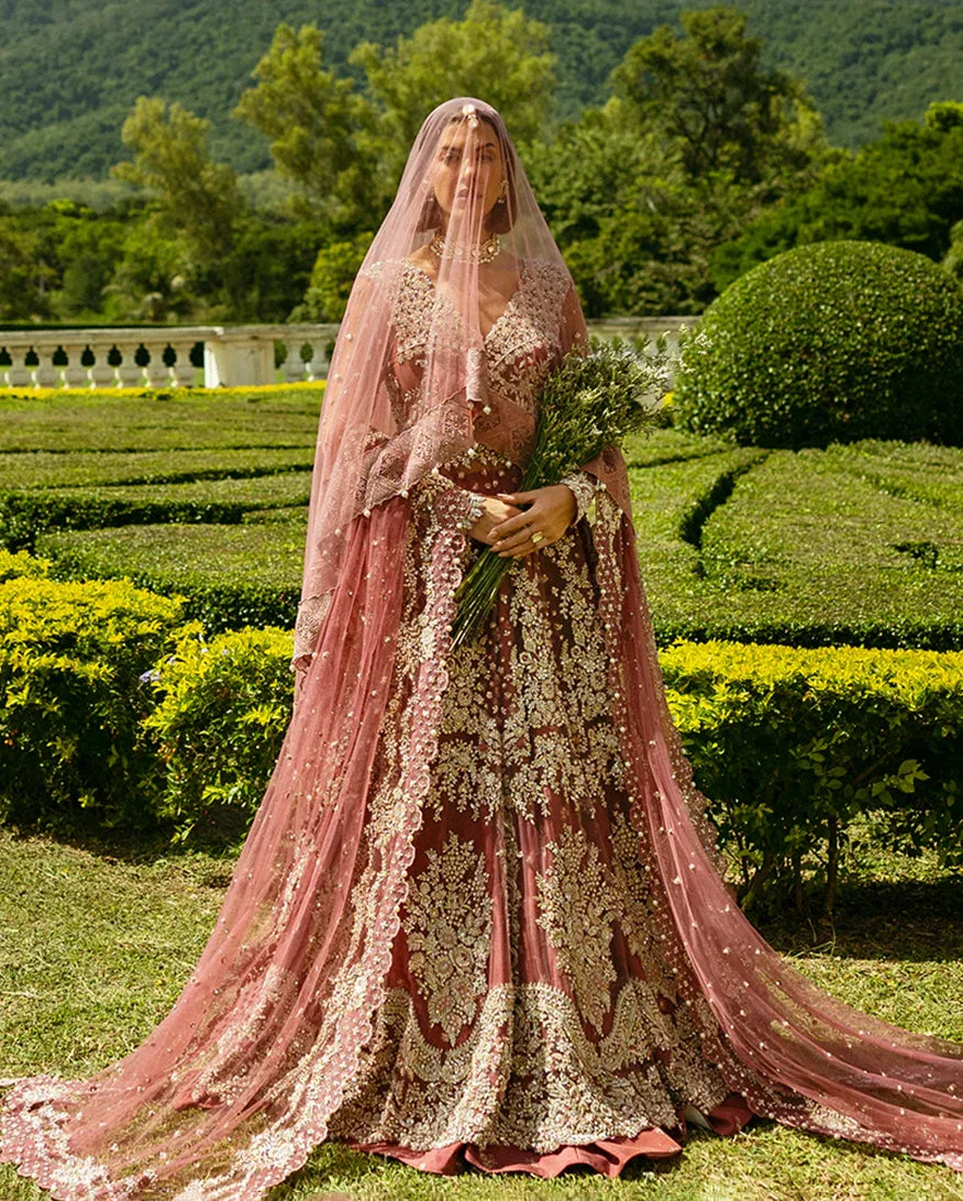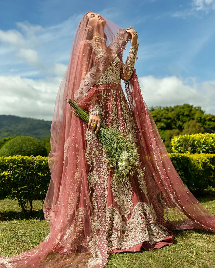 Crafted from net and Korean raw silk, this wedding dress is adorned with beautiful dabka, pearls, and sequins. Detailed thread work and naqshi add depth, while pearl drops bring an elegant finish. A stunning choice for your wedding, Arabella