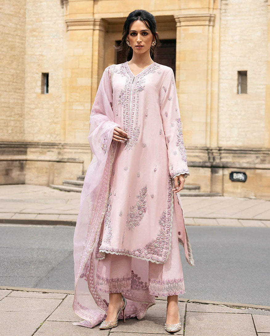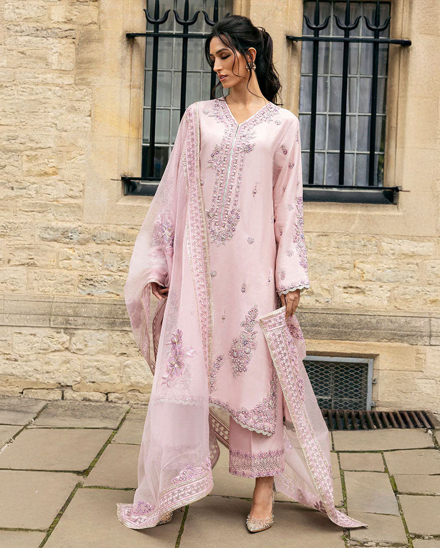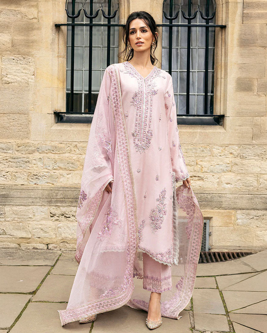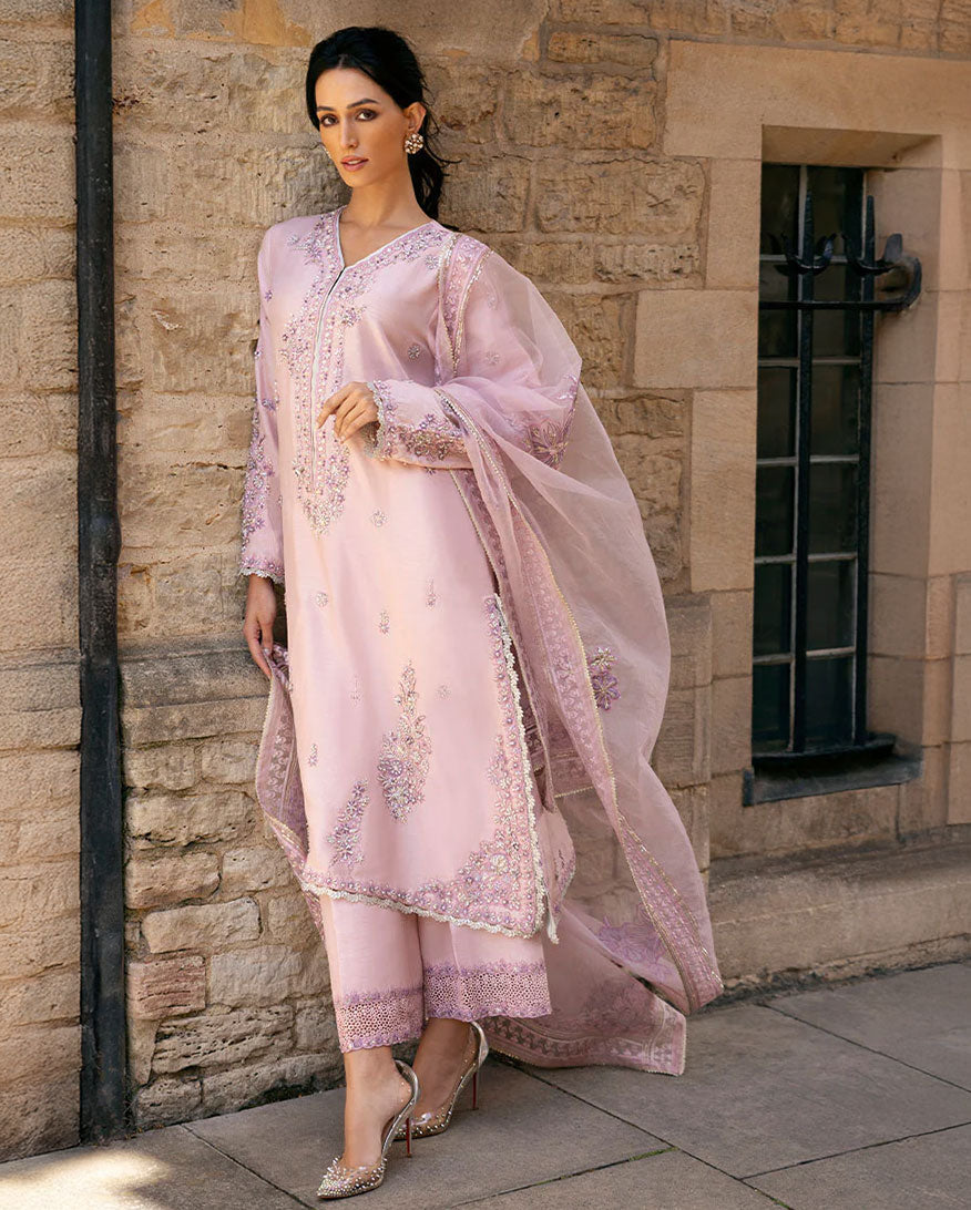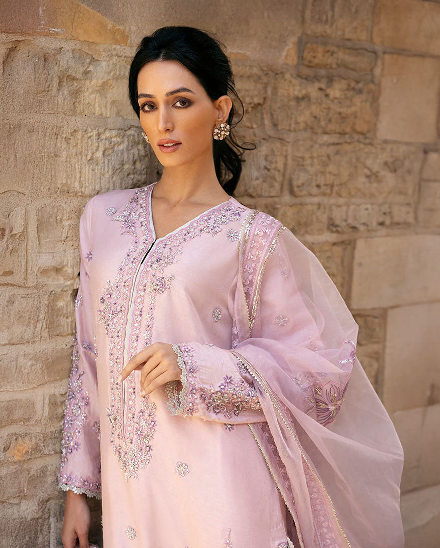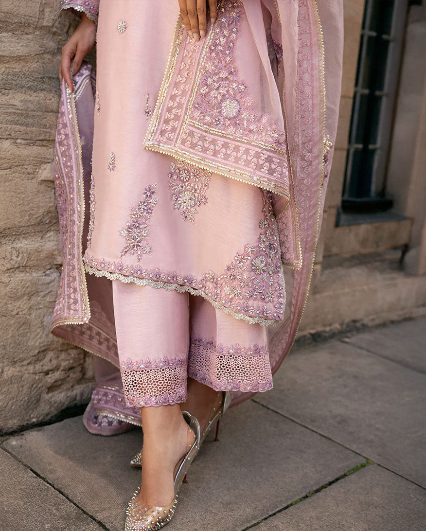 Elevate your style with our exquisite ensemble, featuring pure resham embroidery, hand-embellished Swarovski crystals, tilla, dabka, naqshi, and finishing laces on the daman and hem. The borders are adorned with cutwork laces, adding a touch of sophistication to this masterpiece. Experience the epitome of elegance and make a lasting impression with this stunning outfit. The dupatta includes a four sided border with tilla lace.