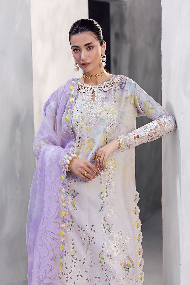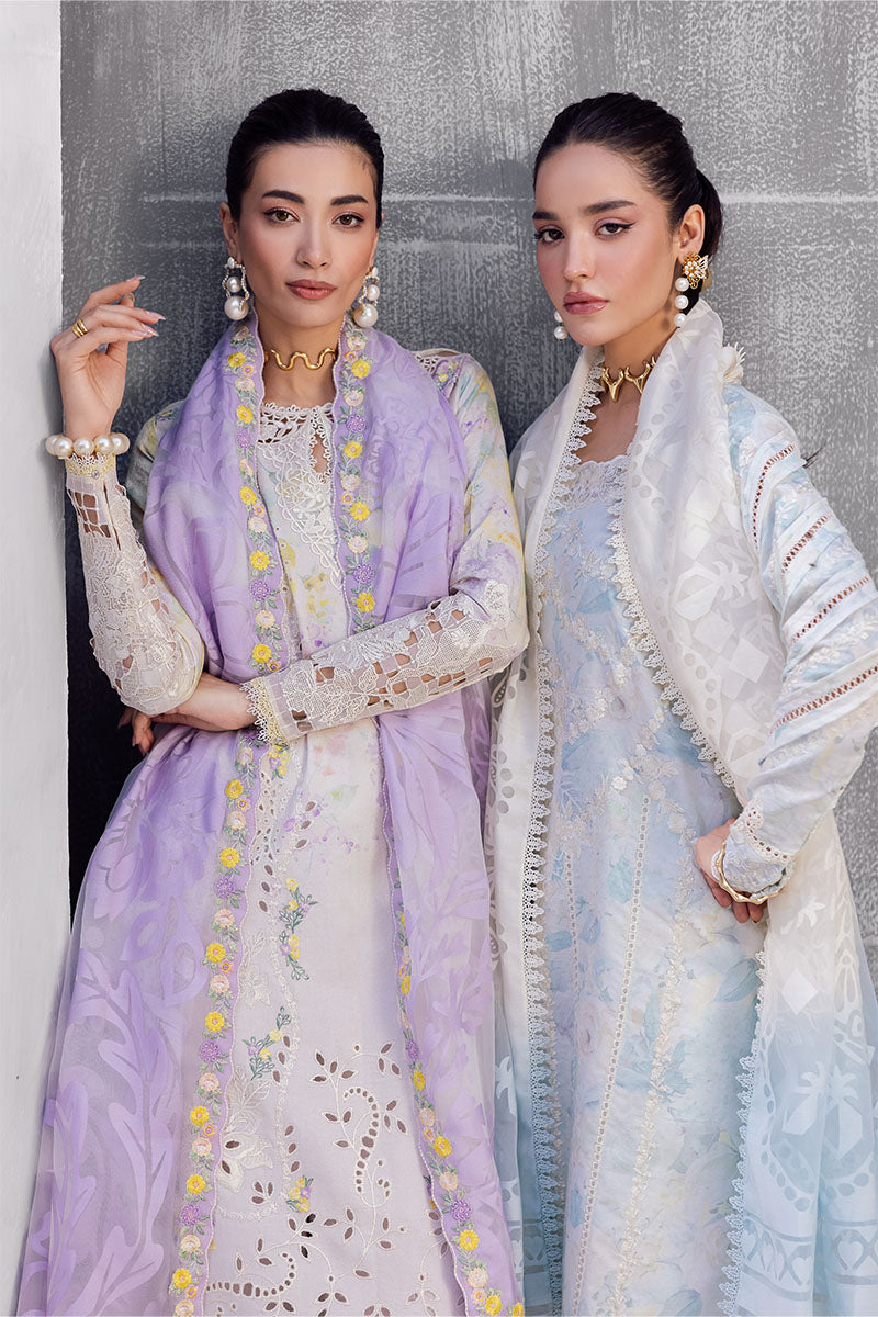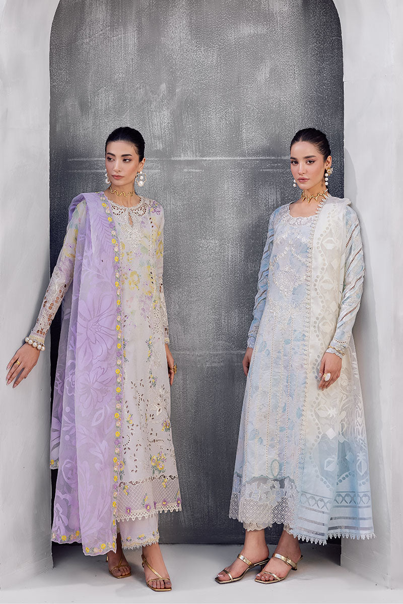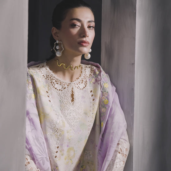 Ayreen — soft serenity with a graceful twist. Drenched in a delicate ivory tone, Ayreen exudes timeless elegance through its finely embroidered lawn fabric and thoughtful detailing. It is paired with a beautifully contrasting lavender dyed burn out dupatta — creating a harmonious blend of subtle sophistication and refreshing colour play.