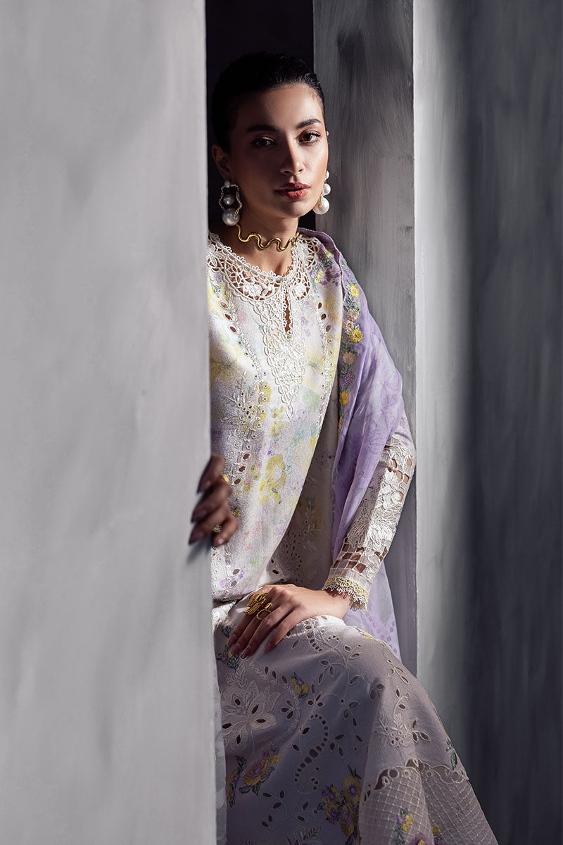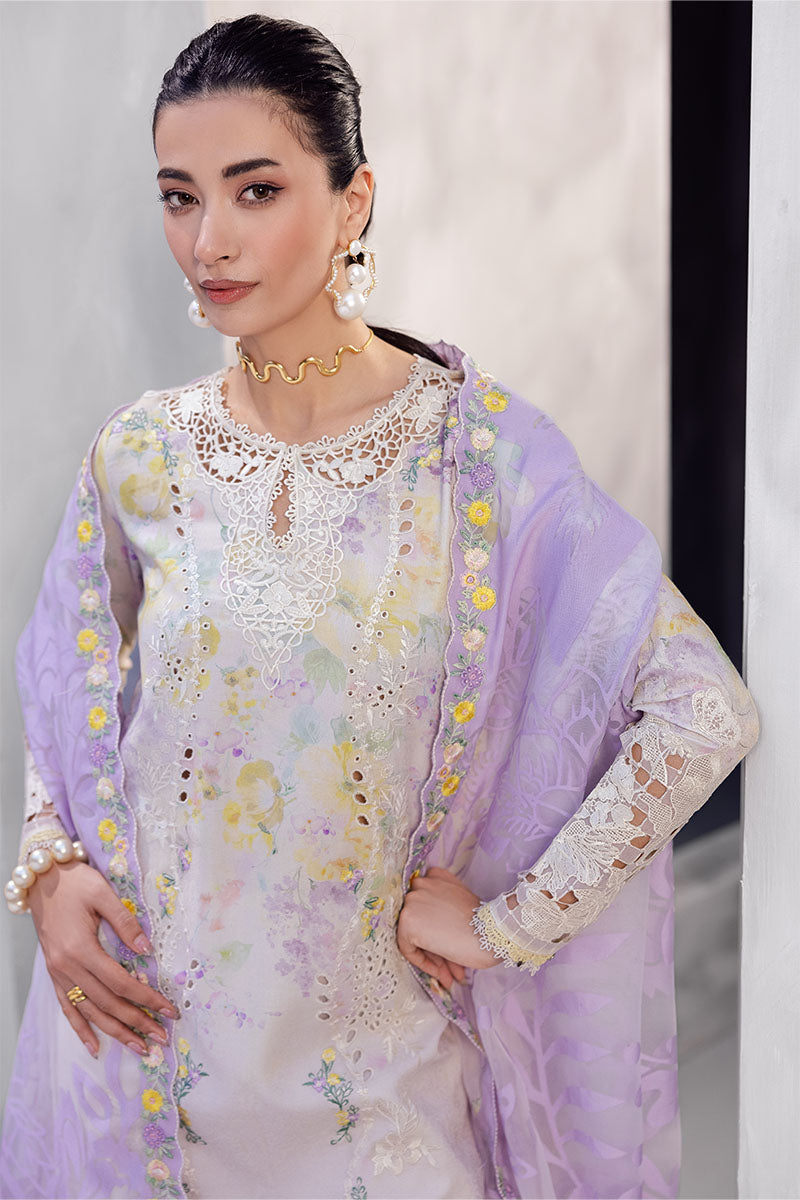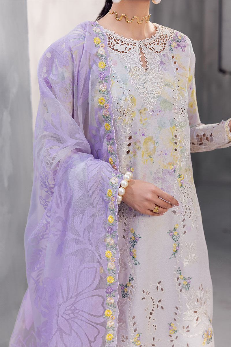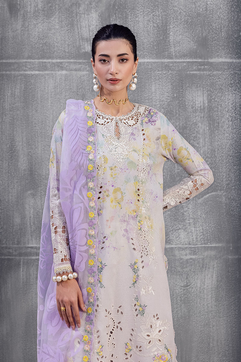 Ayreen — soft serenity with a graceful twist. Drenched in a delicate ivory tone, Ayreen exudes timeless elegance through its finely embroidered lawn fabric and thoughtful detailing. It is paired with a beautifully contrasting lavender dyed burn out dupatta — creating a harmonious blend of subtle sophistication and refreshing colour play.