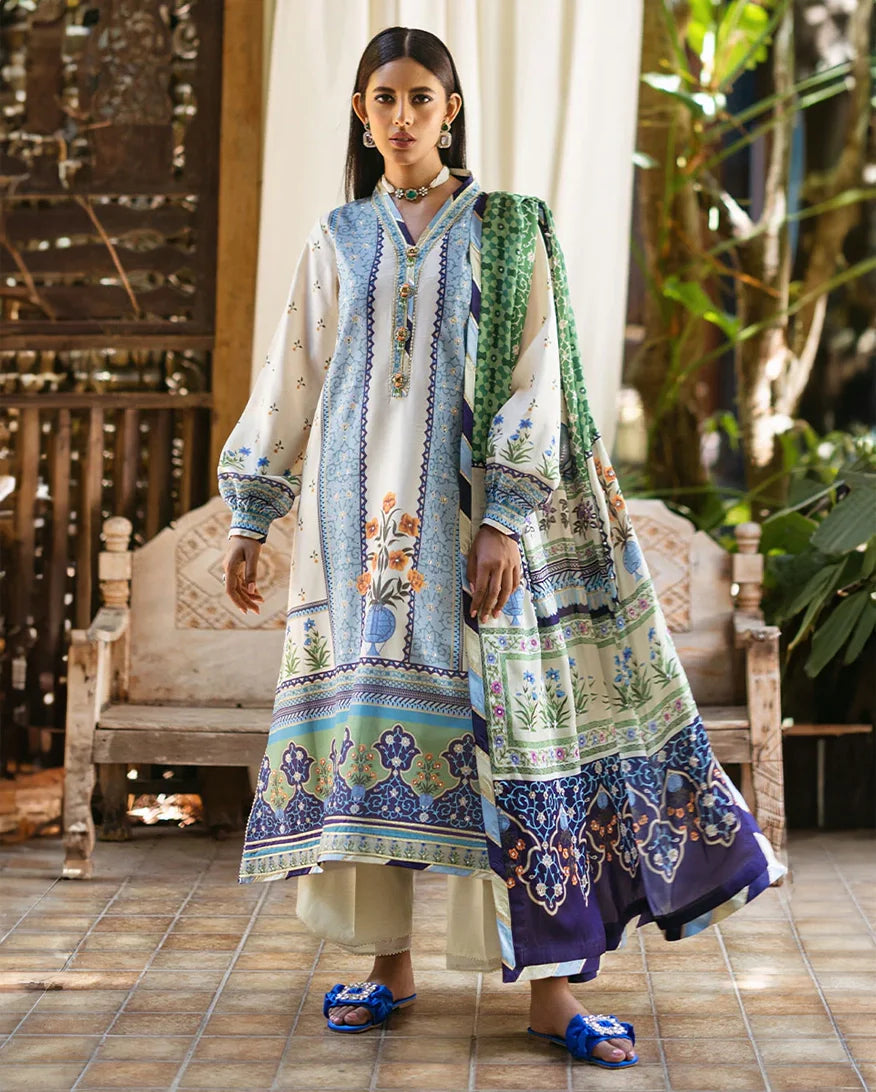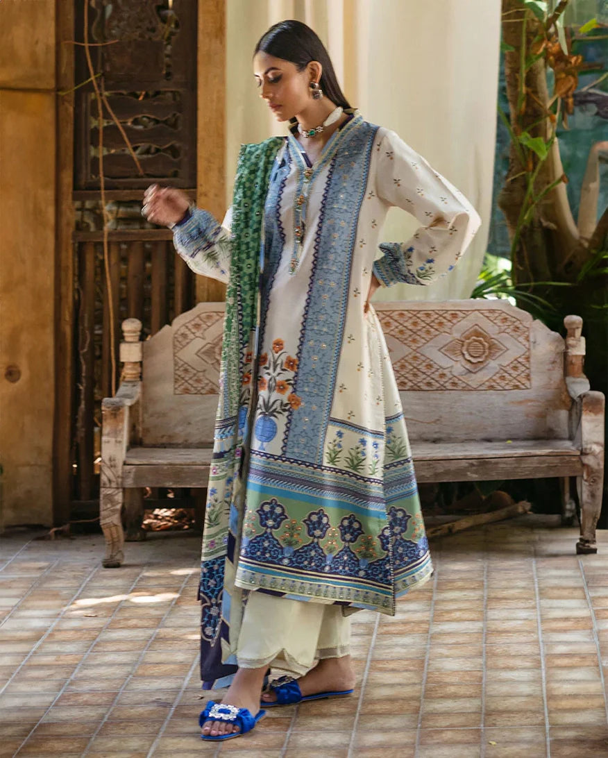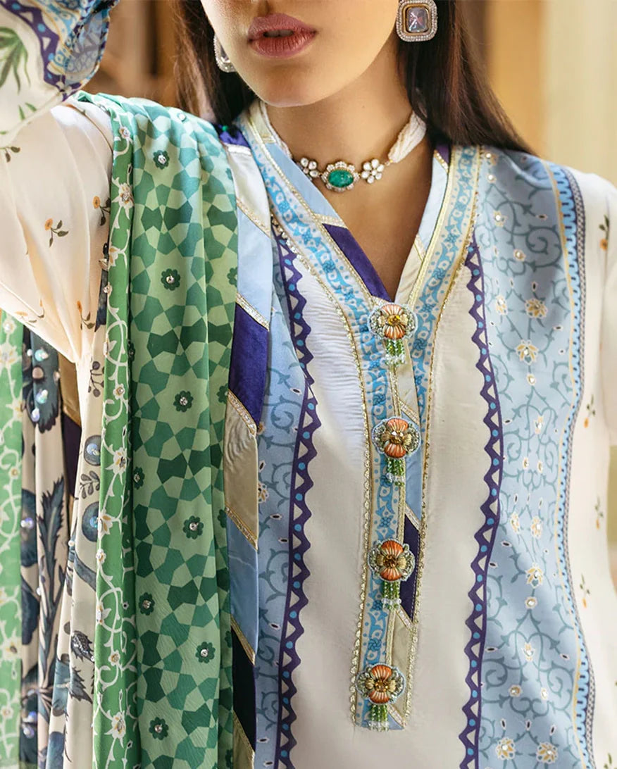Azure, a captivating ensemble in soothing shades of blue and beige, crafted from exquisite raw silk. This outfit features delicate embellishments that enhance its beauty, while the printed design adds a touch of contemporary flair. Accompanied by a flowing silk dupatta, Azure embodies effortless elegance.