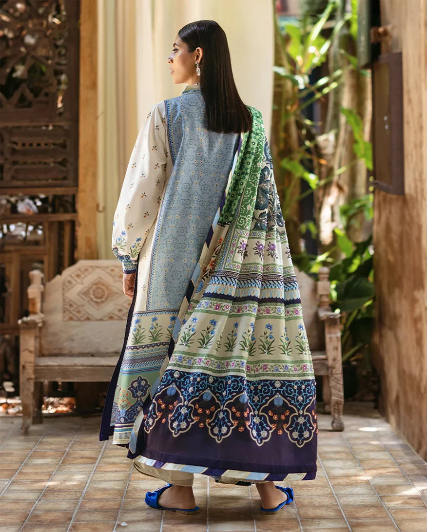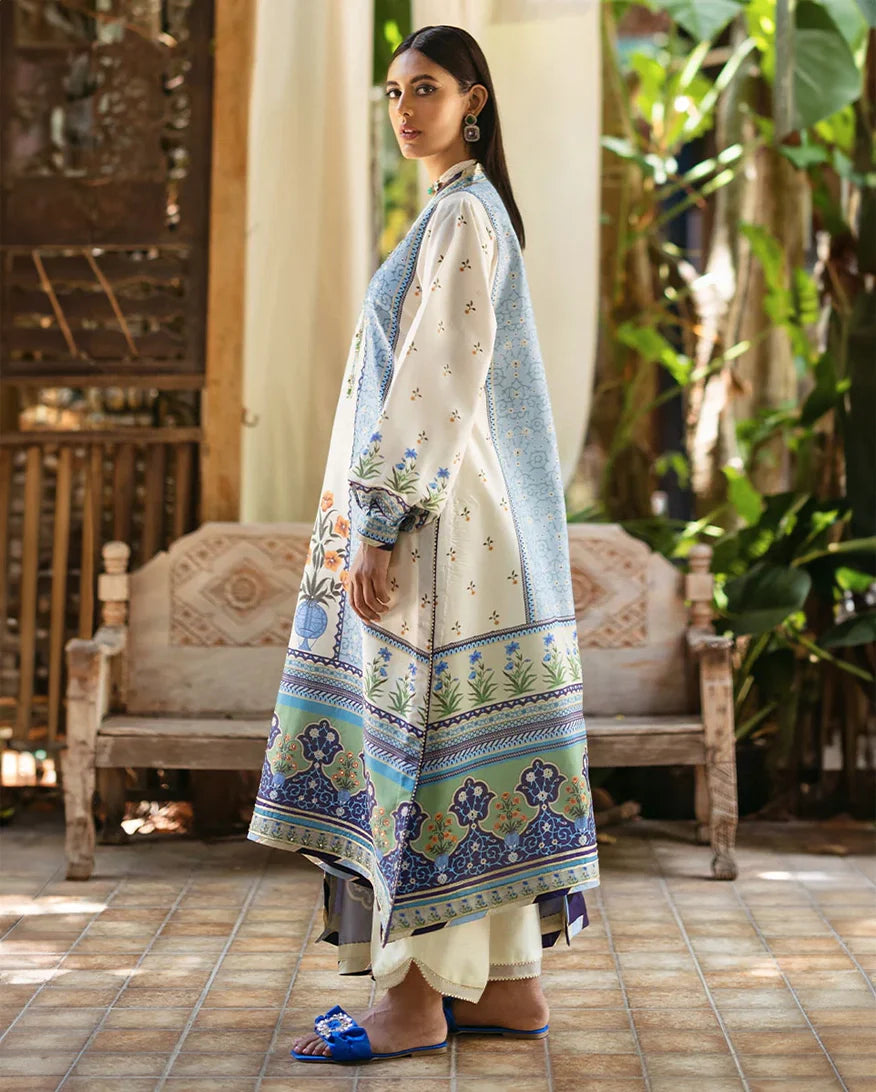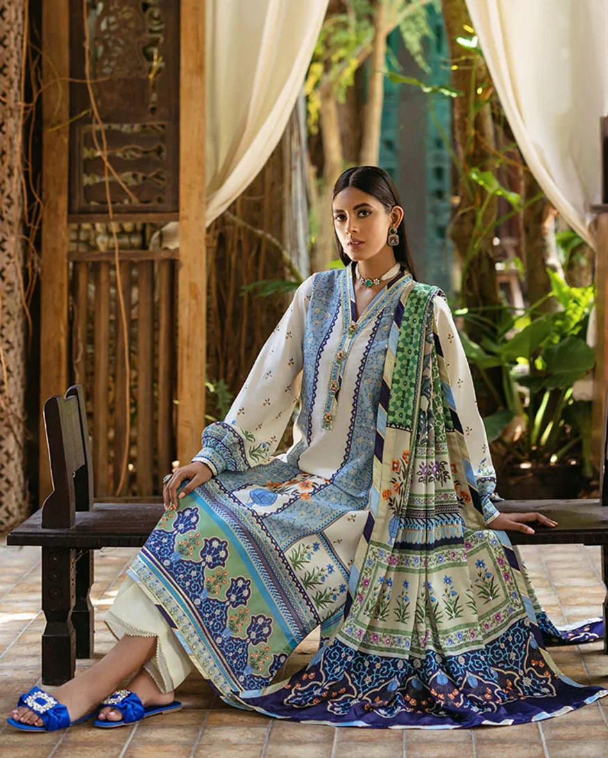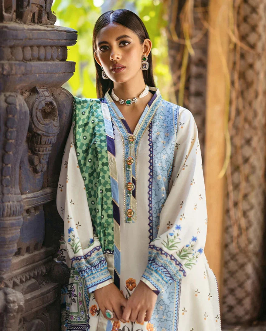 Azure, a captivating ensemble in soothing shades of blue and beige, crafted from exquisite raw silk. This outfit features delicate embellishments that enhance its beauty, while the printed design adds a touch of contemporary flair. Accompanied by a flowing silk dupatta, Azure embodies effortless elegance.