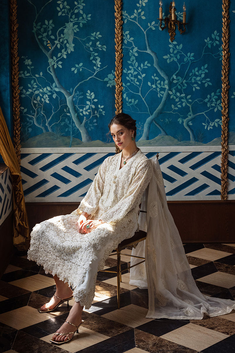 Indulge in timeless elegance with this khaadi cotton net three-piece ensemble. The raw silk shalwar features delicate milky lace on the trouser cuffs, complementing the intricately embroidered two-layered chikankari shirt adorned with light silver sequins and pearl embellishments, and finished with scalloped borders. The pleated neckline with pearl hanging tassels and the four-sided chikankari and cutwork border dupatta complete this sophisticated look. This is a 3 pc outfit.