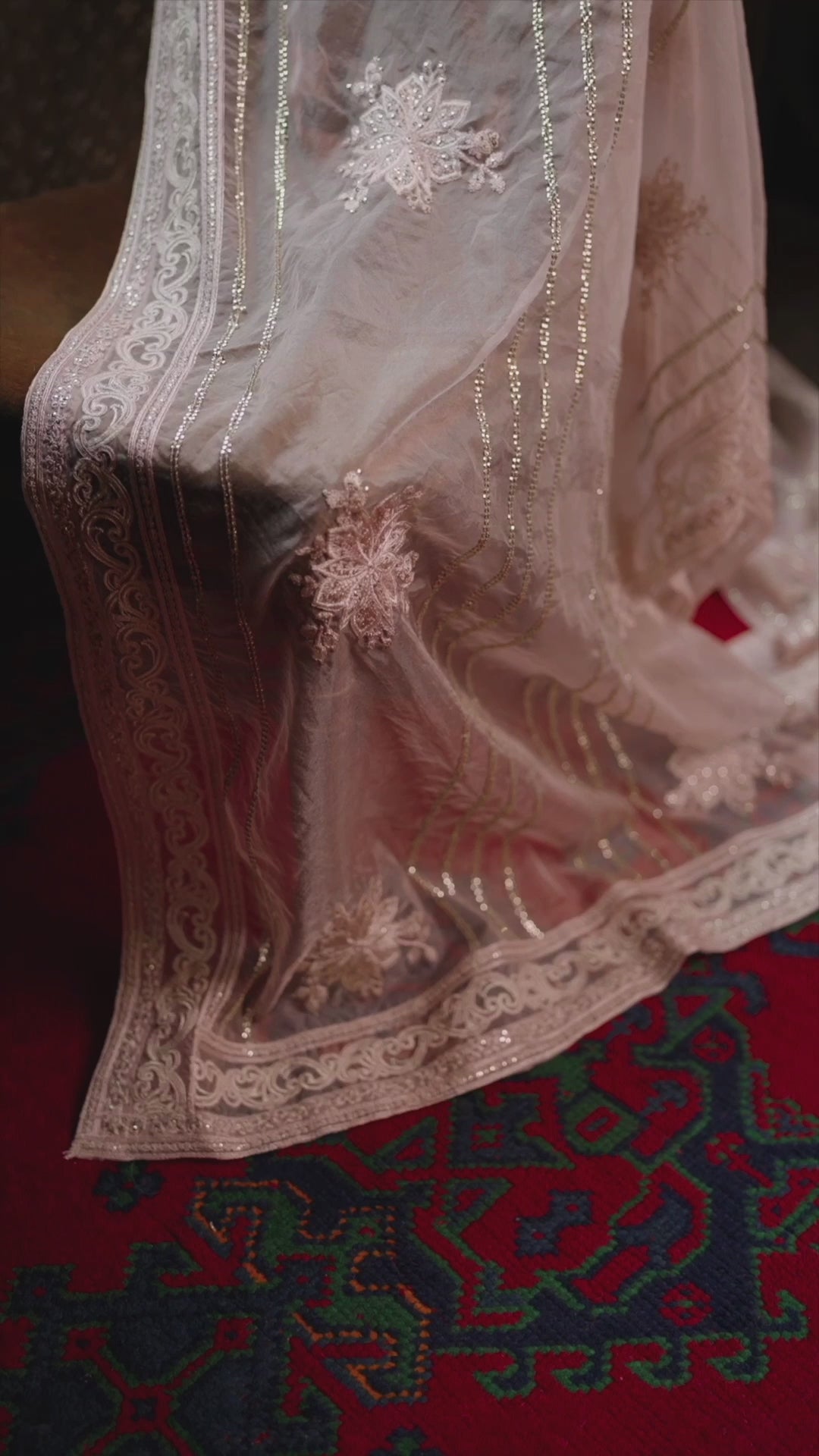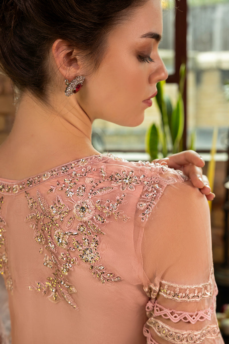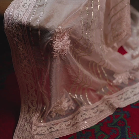 'Calliope' in soft baby pink offers a touch of elegance with its organza shirt, Korean raw silk trouser, and a flowing organza dupatta. For those enchanted by refined details and a timeless allure.