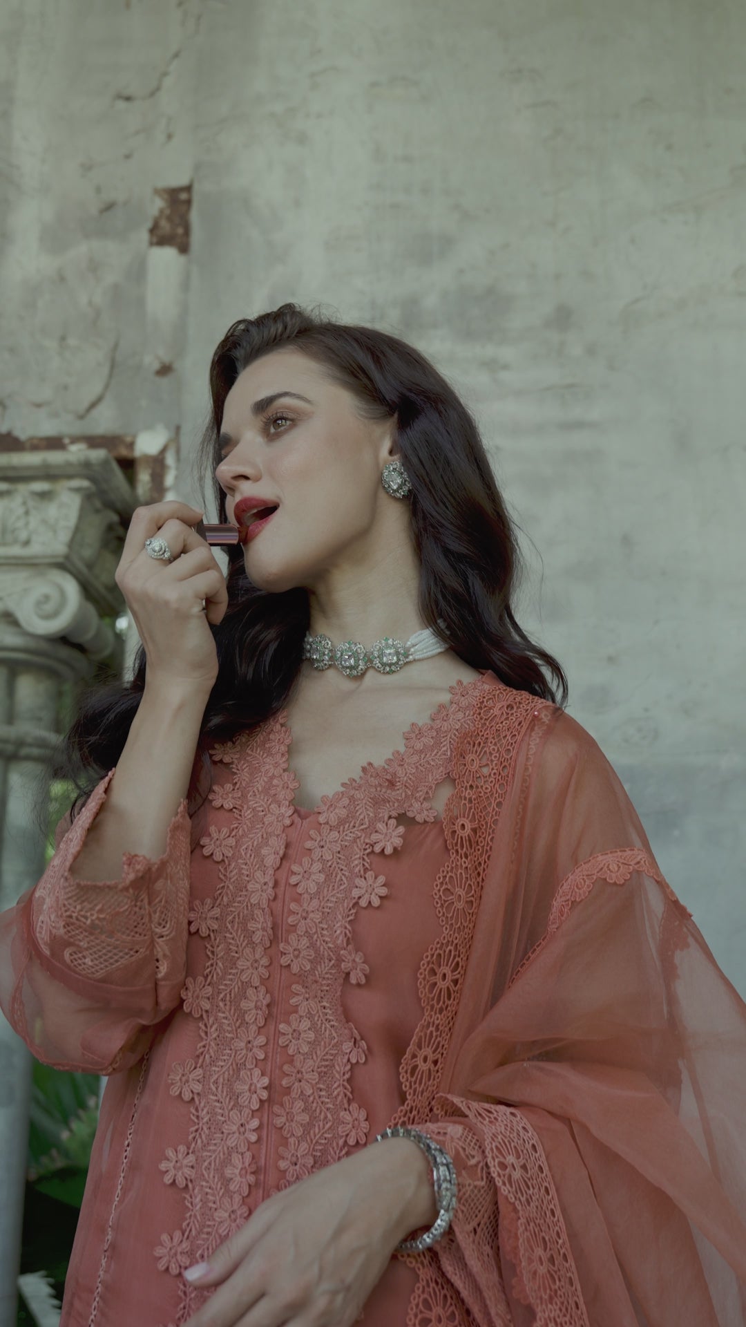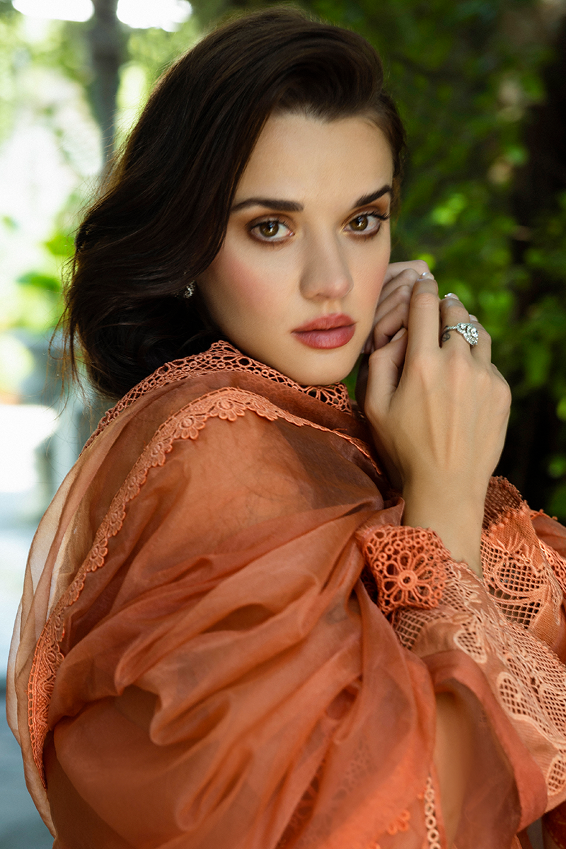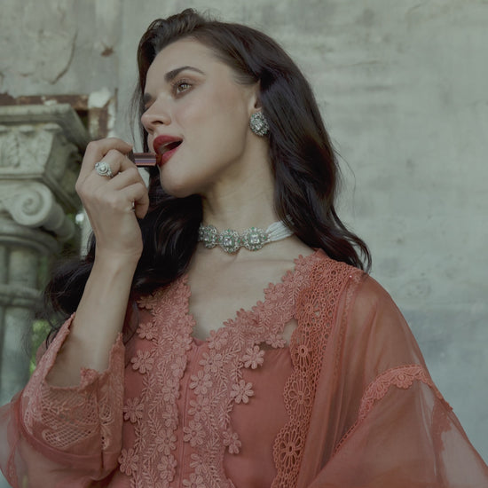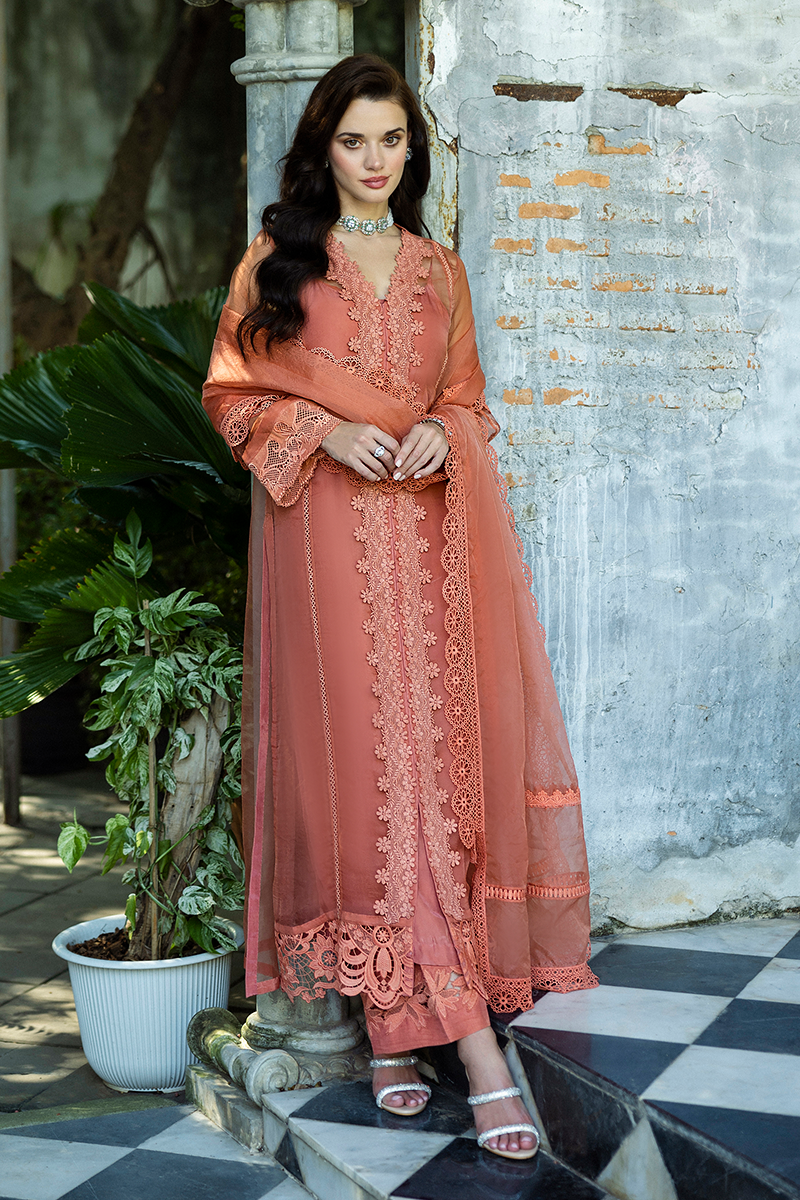 Candace, a mesmerizing ensemble in a vibrant coral hue. Designed to make a statement, this outfit blends festive charm with timeless sophistication. The medium organza shirt features intricate detailing, adding a touch of refined luxury. A sheer BM organza dupatta drapes effortlessly, enhancing the outfit’s ethereal elegance. Raw silk trousers provide a structured yet graceful silhouette, ensuring both comfort and style. Lined with a silk inner, offering a smooth and luxurious feel.