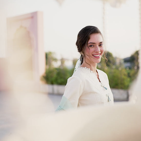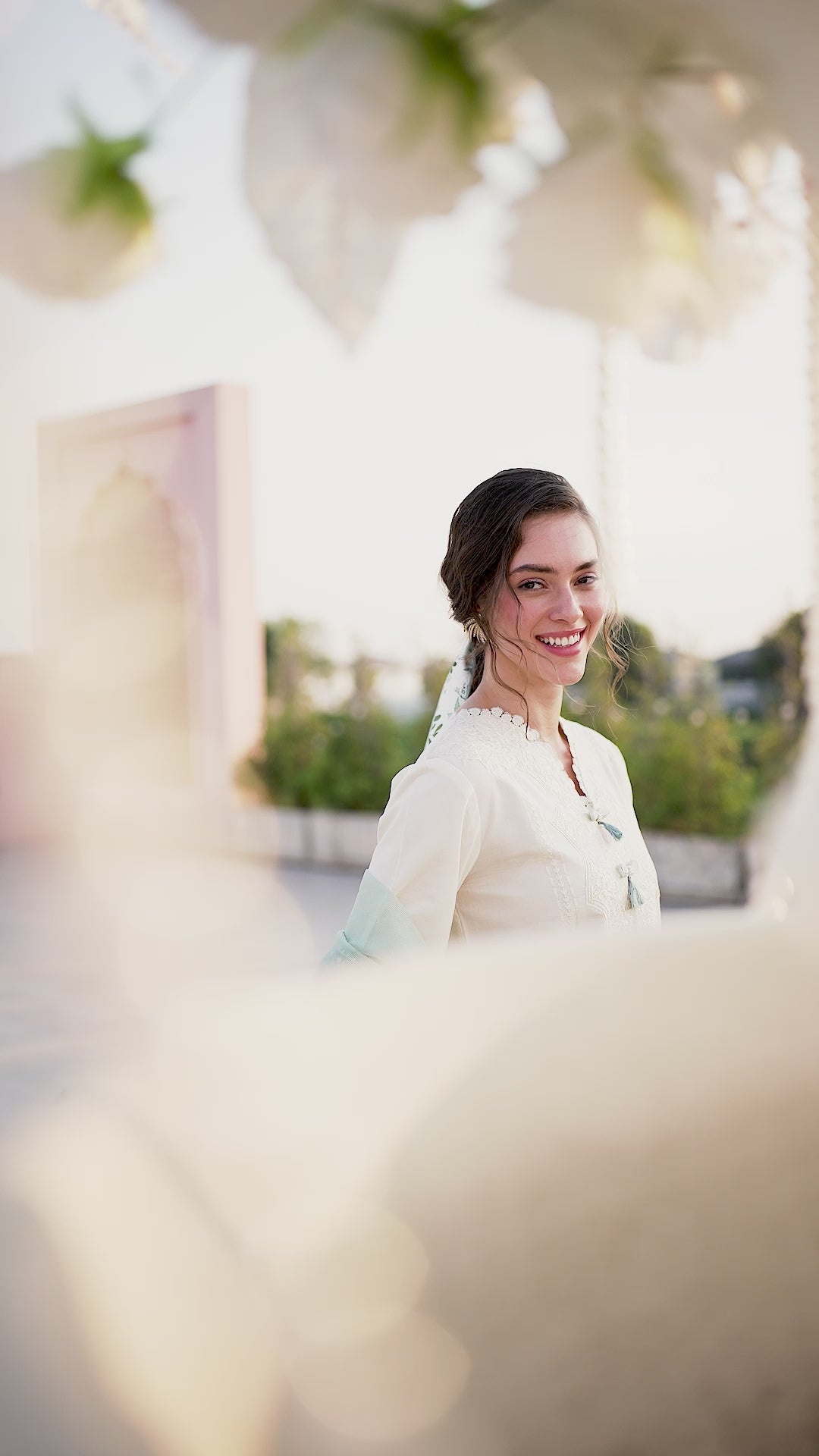 Coastal Serenity, our mesmerizing aqua green and white outfit that captures the essence of tranquil coastal vistas. This ensemble evokes the soothing hues of ocean waters, inviting you to immerse yourself in serene elegance. With its flowing silhouette and subtle detailing, including delicate embroidery reminiscent of seashells and waves, this outfit exudes a sense of calm sophistication.