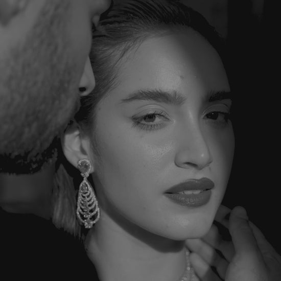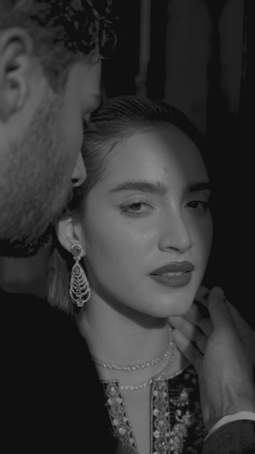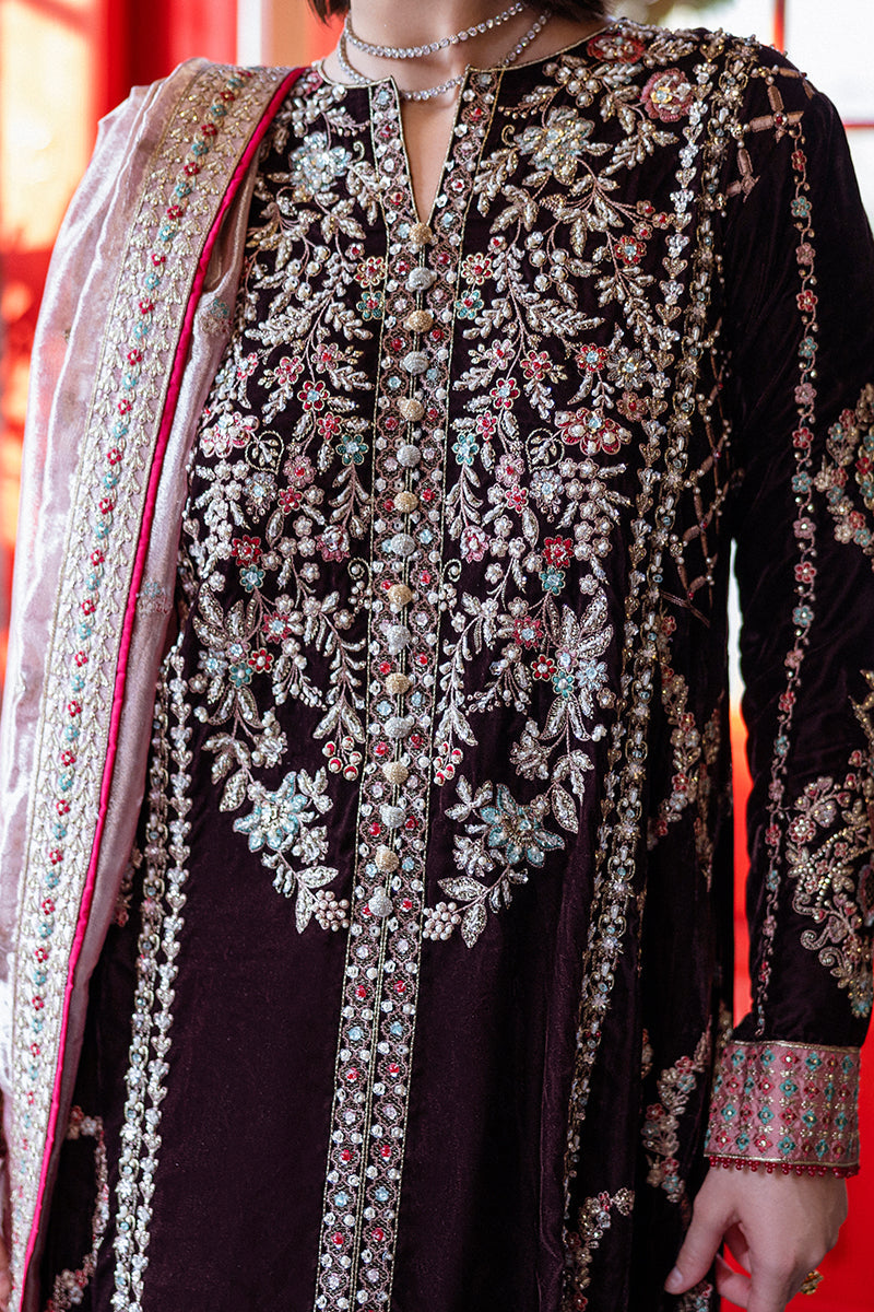 A masterpiece in velvet adorned with intricate embroidery and shimmering sequins across the front, back, and sleeves. Side panels, daman, and silk borders add an opulent finish, while the zari dupatta with embroidered palu lace complements the look. Paired with raw silk trousers and tilla lace, golden and silver naqshi balls, and pearls for a touch of luxury.
