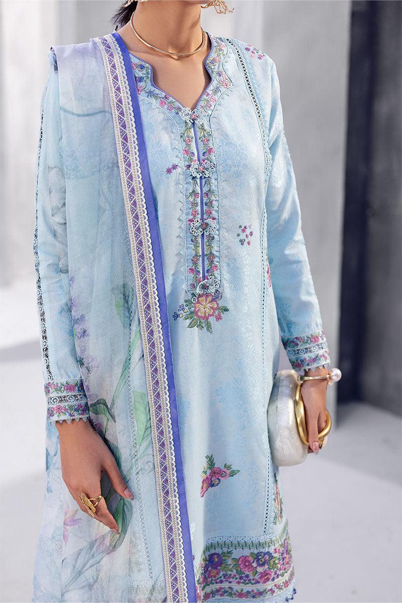 Elara — where cool tones meet timeless grace. In a serene shade of ice blue, Elara captures the essence of effortless elegance. Crafted from finely embroidered lawn, this ensemble is paired with a beautifully printed rocket net dupatta — offering a look that’s as fresh as a summer breeze and as graceful as ever.