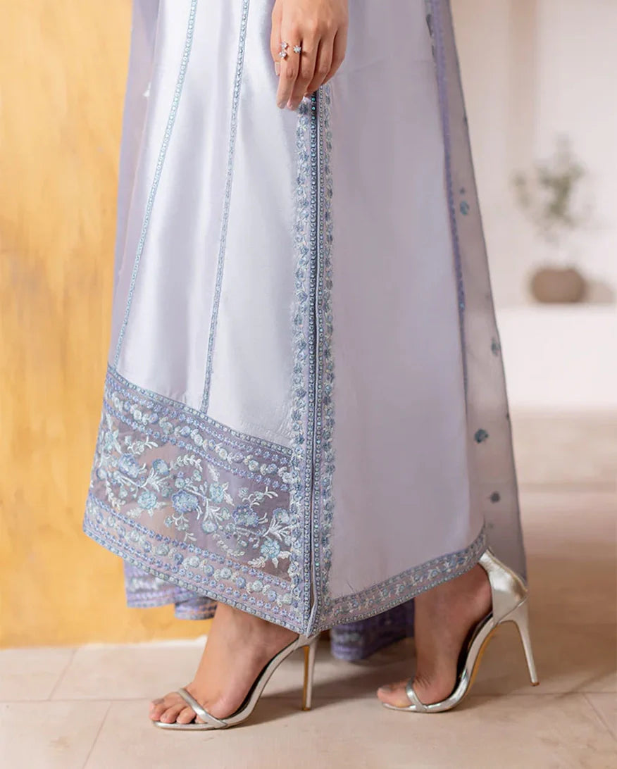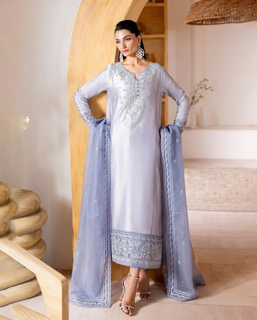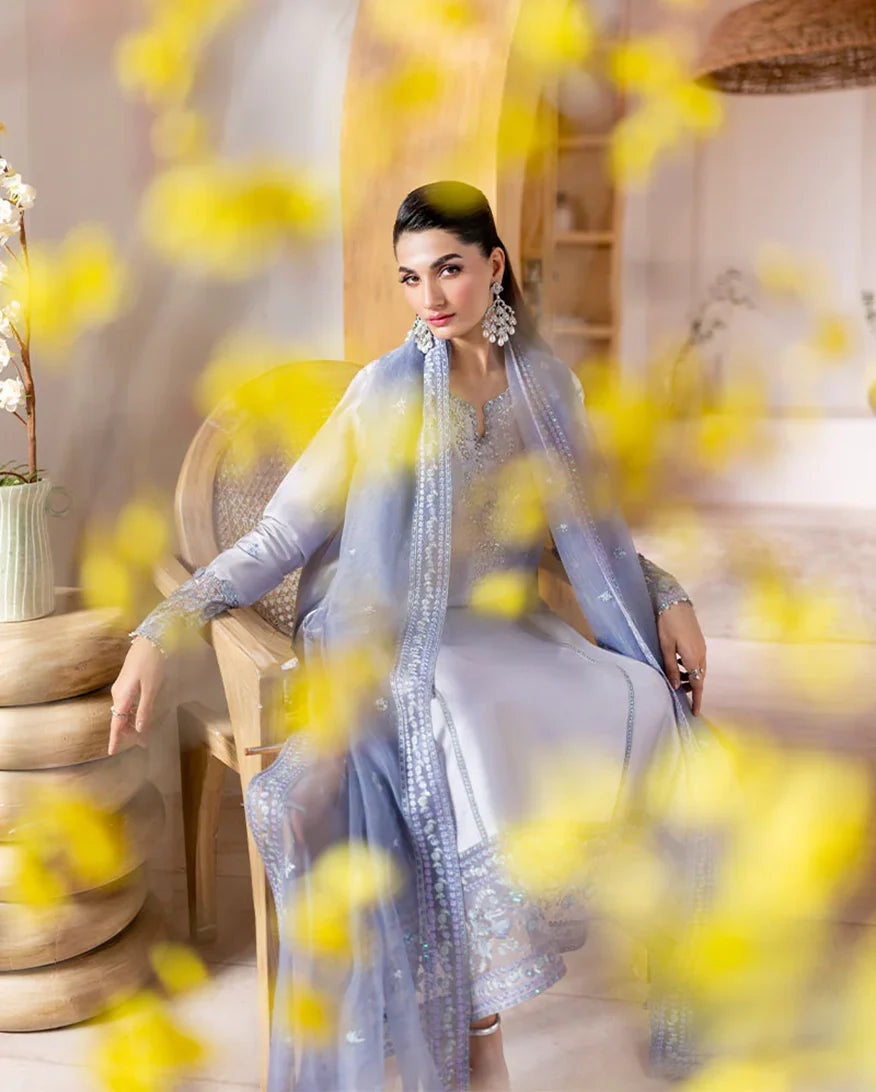 Elya - Elegance in every shimmer. Draped in a radiant silver, Elya features a sheesha silk shirt adorned with intricate floral embroidery, delicately enhanced with hand ample pearls and sequins on the neckline and sleeves for a refined sparkle. A flowing rocket net dupatta with finely embroidered borders and subtle sequin accents adds a gentle shimmer, perfectly complemented by straight-cut raw silk trousers for a polished, graceful finish. Timeless shine, effortlessly worn.