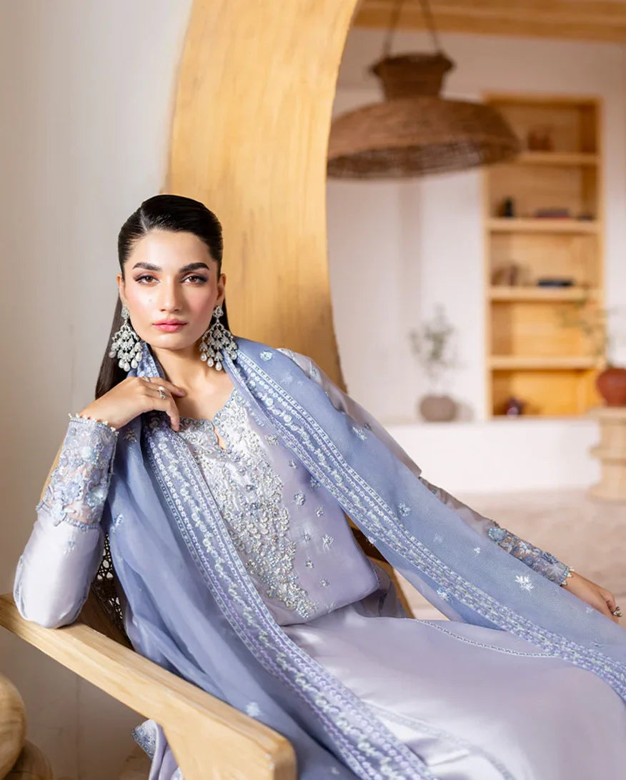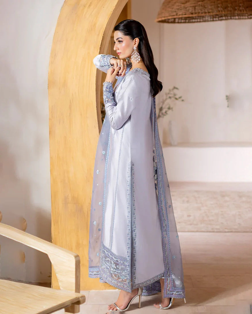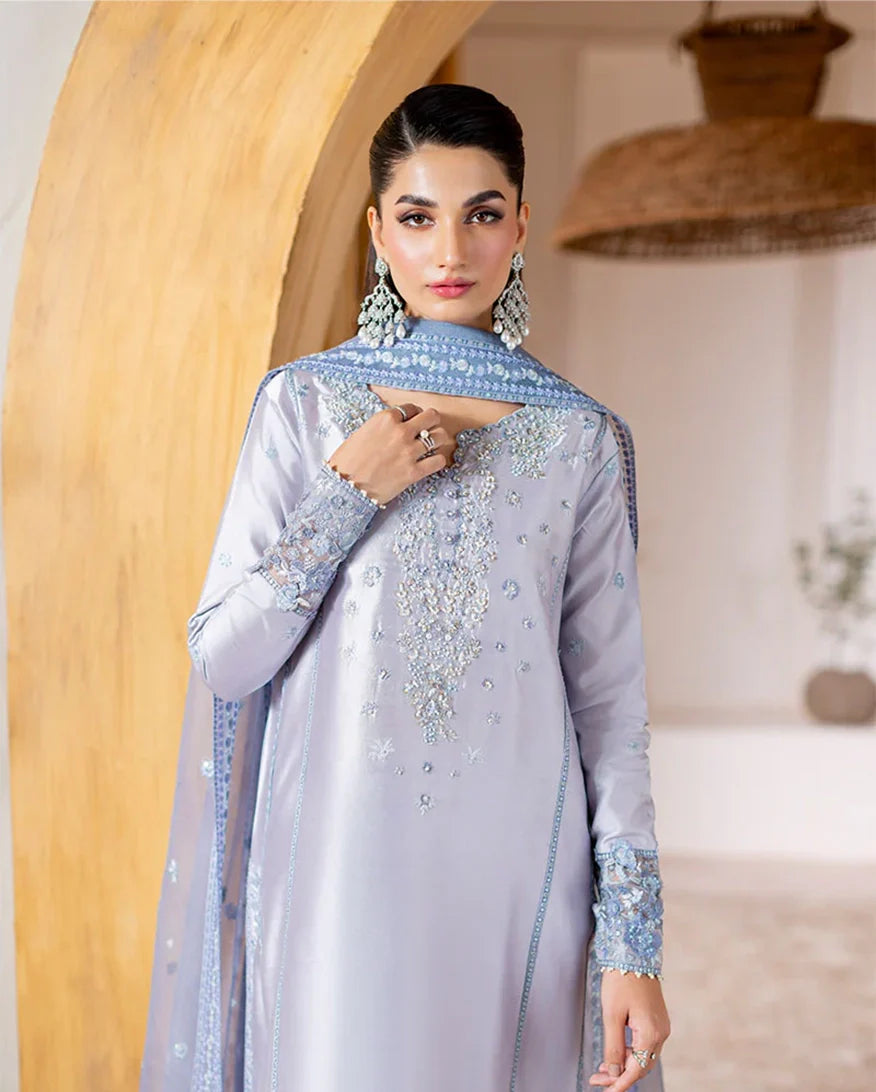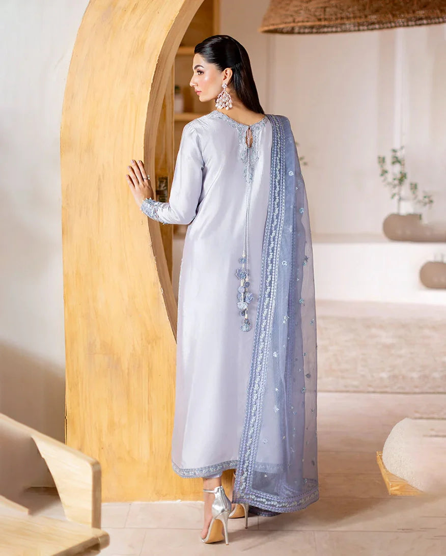 Elya - Elegance in every shimmer. Draped in a radiant silver, Elya features a sheesha silk shirt adorned with intricate floral embroidery, delicately enhanced with hand ample pearls and sequins on the neckline and sleeves for a refined sparkle. A flowing rocket net dupatta with finely embroidered borders and subtle sequin accents adds a gentle shimmer, perfectly complemented by straight-cut raw silk trousers for a polished, graceful finish. Timeless shine, effortlessly worn.