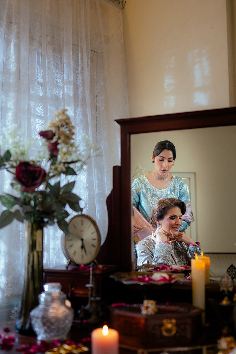 Eman is a stunning ensemble crafted with meticulous attention to detail. The satin zari fabric shirt features intricate embroidery and embellishments, showcasing timeless artistry. Paired with luxurious jamawar trousers and a delicate zari tissue dupatta, this outfit exudes sophistication and grace. Eman is a perfect choice for those seeking a blend of classic charm and modern elegance.
