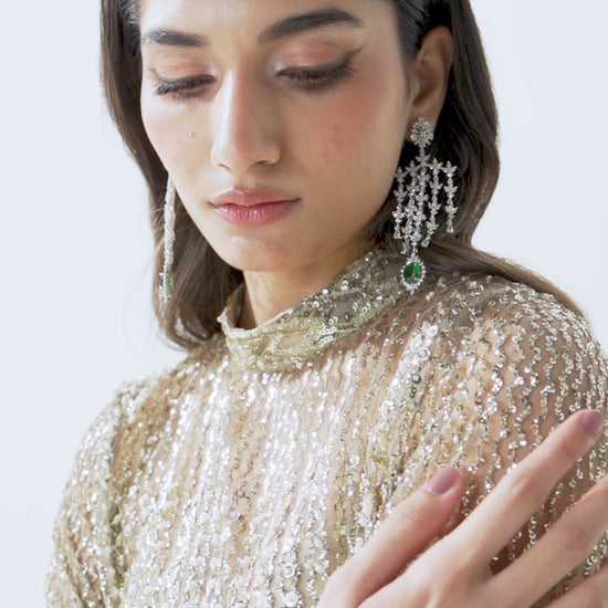 Crafted from a delicate net canvas in a mesmerizing pale gold hue, the pale gold radiant ensemble Eve, is adorned with an exquisite array of crystals, pearls, and swarovski elements. Each element is meticulously placed to create a celestial symphony, transforming the ensemble into a dazzling masterpiece.