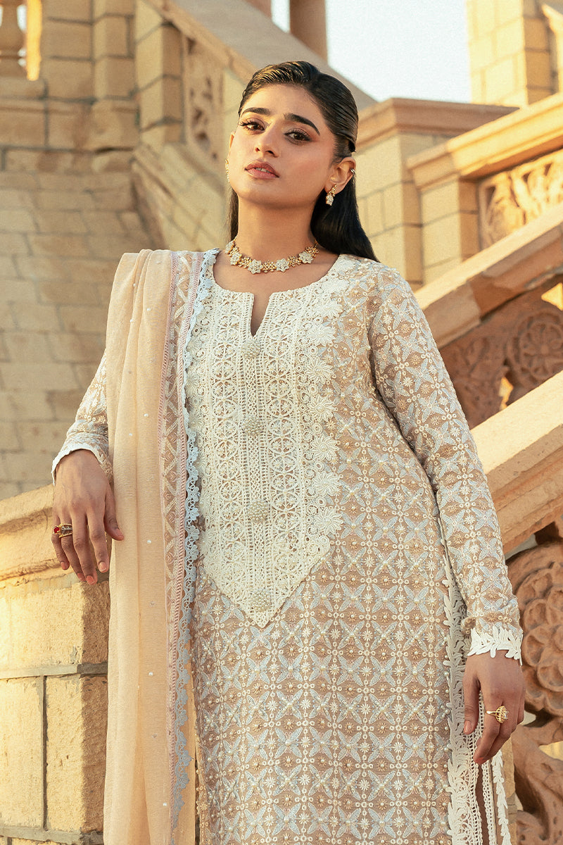Step into sophistication with Faria, a delicately designed three-piece ensemble that embodies grace and elegance. Crafted from premium cotton net, this outfit is adorned with intricate embroidery and subtle embellishments, creating a timelessly refined look. The beautifully detailed shirt is paired with a matching trouser, while the lightweight dupatta adds an ethereal touch. Perfect for Eid, Faria is a blend of tradition and modern charm, making it an essential addition to your festive wardrobe.