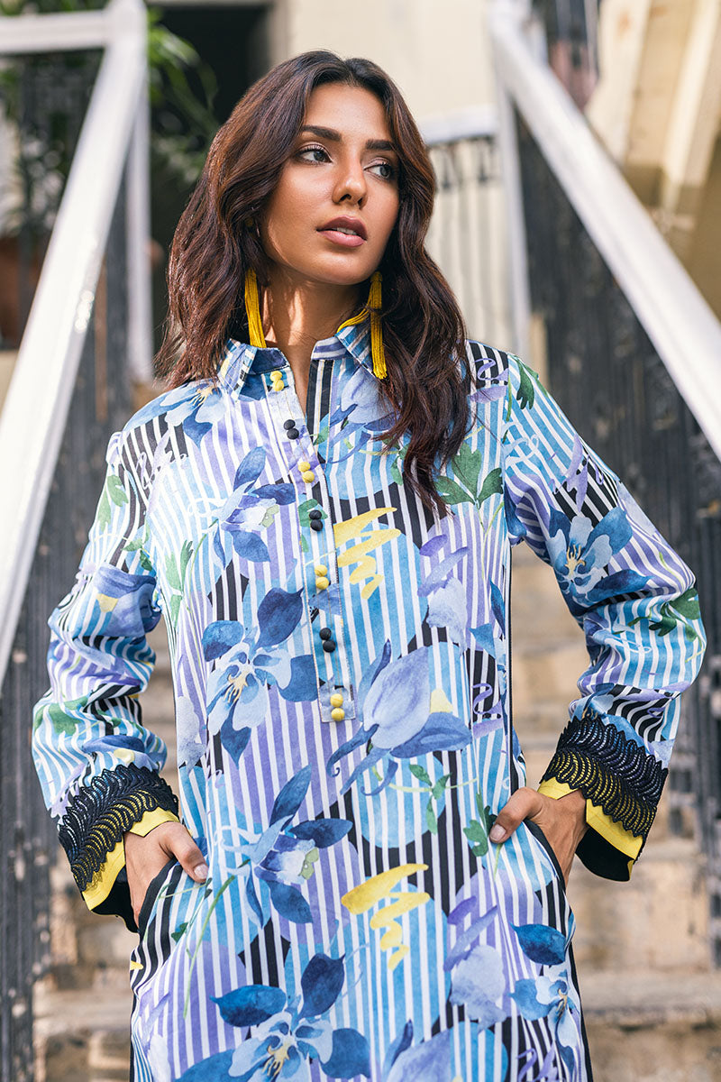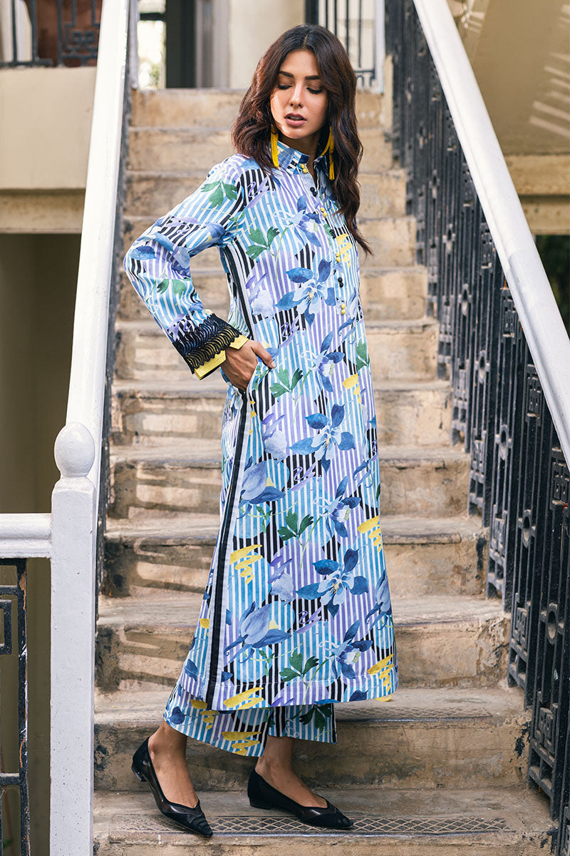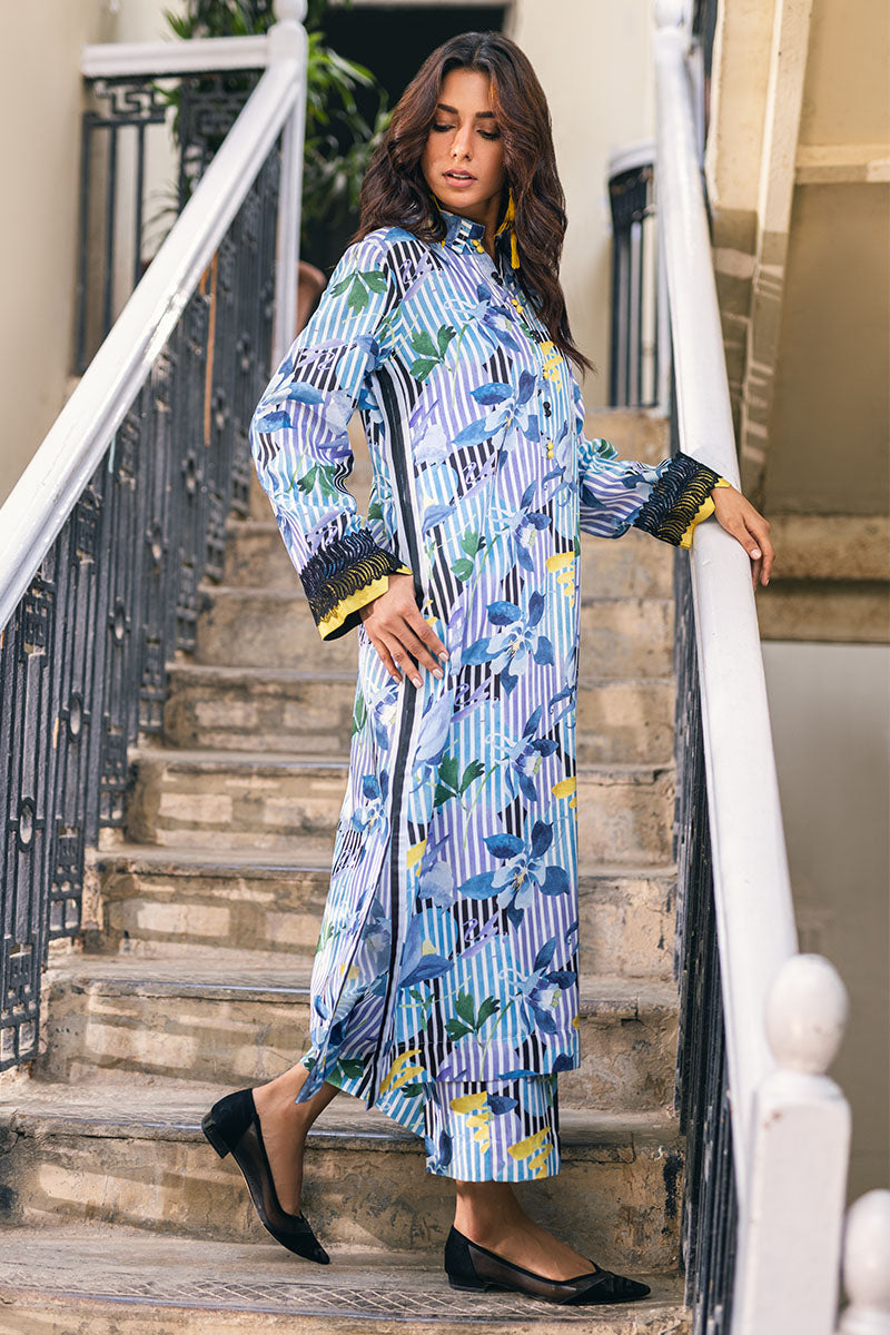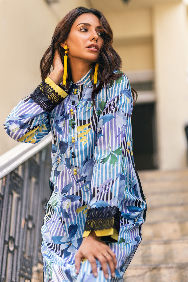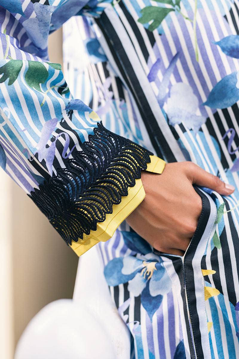 The enchanting printed outfit is a visual masterpiece, capturing the essence of sophistication and modern allure. It features an intricate display of bold motifs that are artfully printed on the striped base thus lending an air of understated elegance to the wearer.