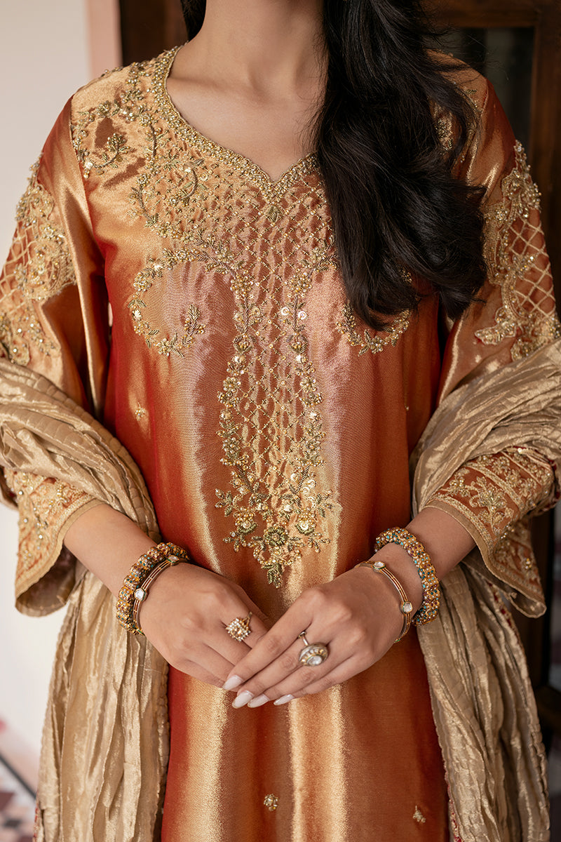 GUL is a perfect design to celebrate the winter weddings with its warm palette. Rusty organge zari tissue shirt is heavily embellished in gold on the front, back and sleeves. A crushed tissue organza dupata and a maroon jamawar slim shalwar complement this outstanding design.