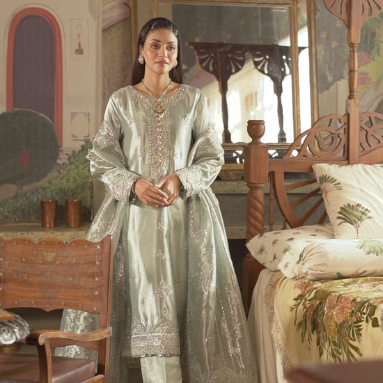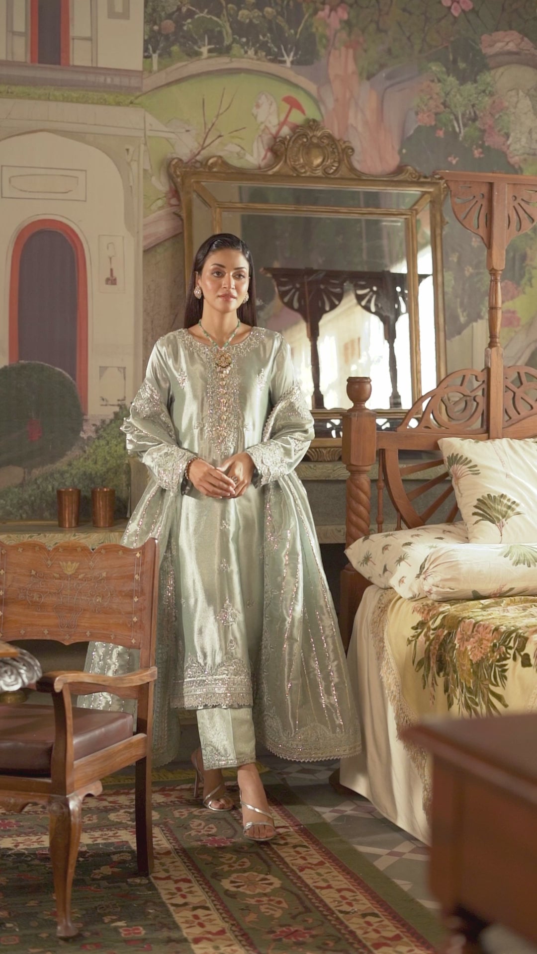 Indulge in ethereal elegance with our sea green silk ensemble, adorned with exquisite hand embellished details. Delicate motifs and intricate patterns, meticulously crafted with fine artistry, grace the fabric, radiating a subtle yet captivating charm, perfect for making a sophisticated statement.