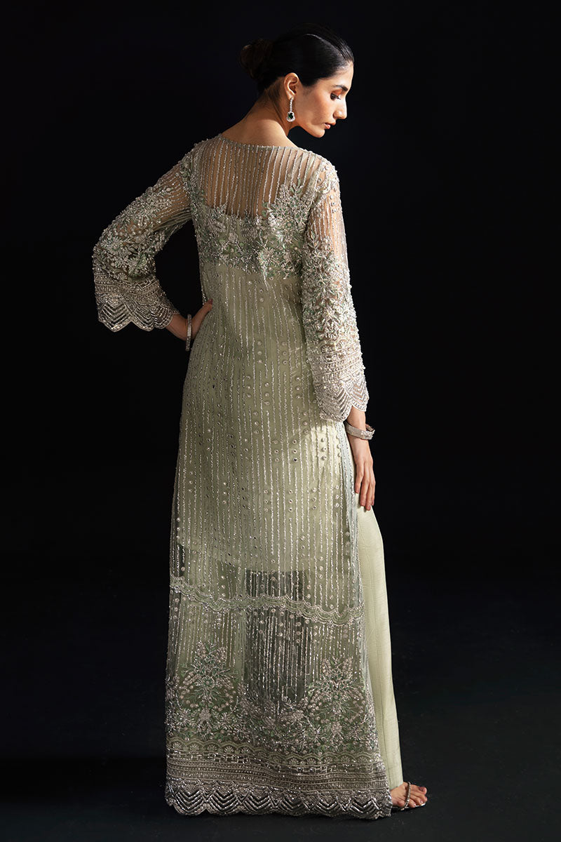 Ina rendered in a powder green shade, embodies ethereal beauty and timeless grace. This enchanting outfit is meticulously adorned with an exquisite array of pearls, crystals, and dabka embroidery, creating a wearable masterpiece that makes you an epitome of sophistication