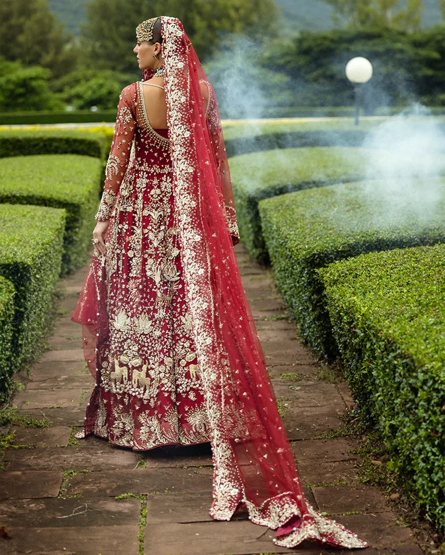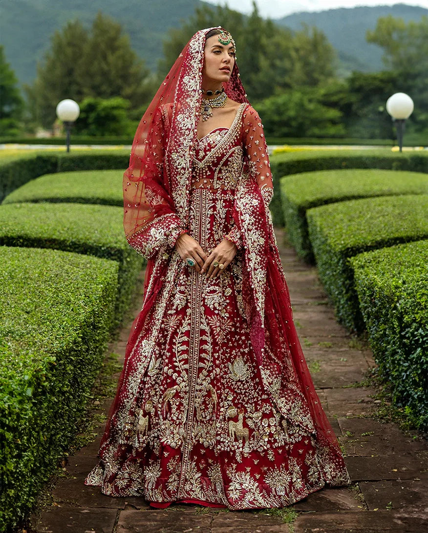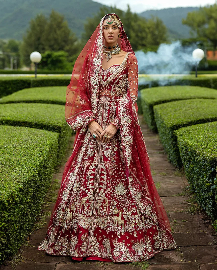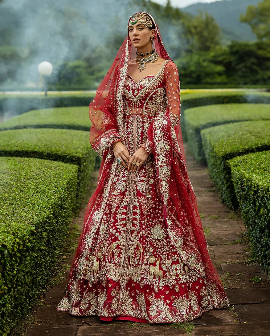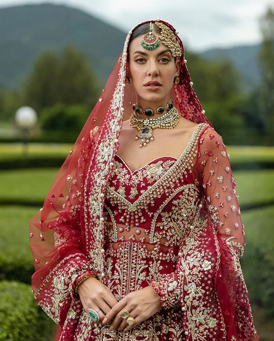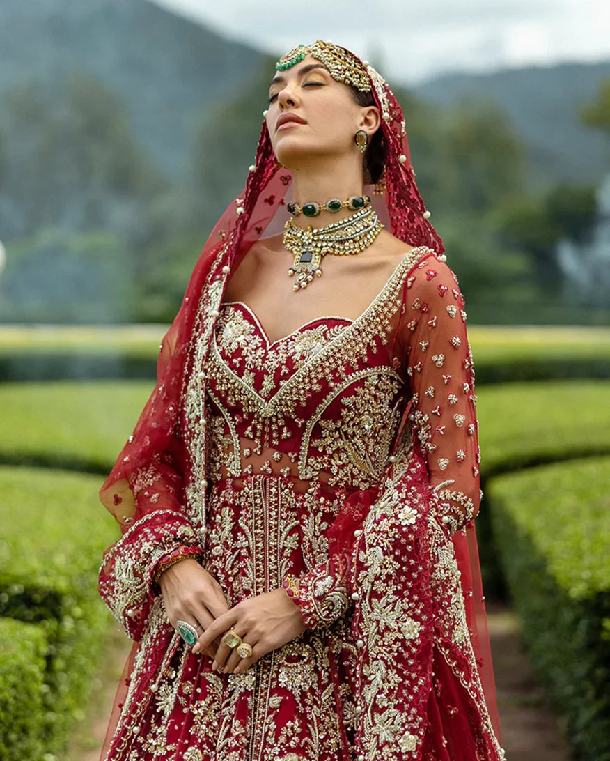 Radiant in red, this bridal ensemble captures the essence of timeless tradition and romance. Adorned with intricate dabka, pearls, and shimmering Swarovski crystals, the net slit shirt with delicate tassels beautifully complements the luxurious Korean raw silk lehenga. Crafted for the bride who seeks elegance and grandeur on her special day.