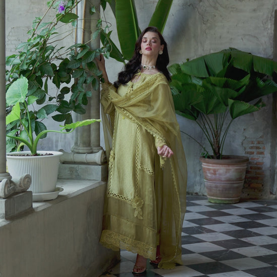 Jules - a stunning ode to timeless elegance. Drenched in a sophisticated olive hue, this ensemble is designed for those who appreciate understated luxury. The jacquard fabric shirt boasts exquisite intricate detailing, adding depth and texture to your festive look. A BM organza dupatta cascades effortlessly, infusing the ensemble with ethereal charm. Raw silk trousers provide a structured yet graceful finish, ensuring a refined silhouette. Lined with a silk inner, offering unmatched comfort and a seamless drape.