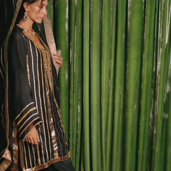 A mesmerizing ode to the timeless elegance of black. Raw silk adorned with intricate gota work, perfect for making a statement.