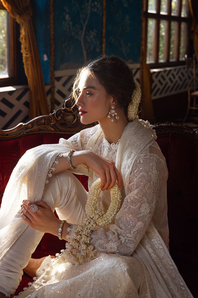 Discover elegance in our exquisitely curated ensemble Ladan. Featuring a raw silk shalwar and a chikankari embroidered shirt with a light sequins spray. The look is further accentuated with a milky lace on the neckline, sleeves, and borders. The khadi net dupatta, embellished with chikankari embroidery and pearl tassels, perfectly complements the refined look. This is a 3 pc outfit.