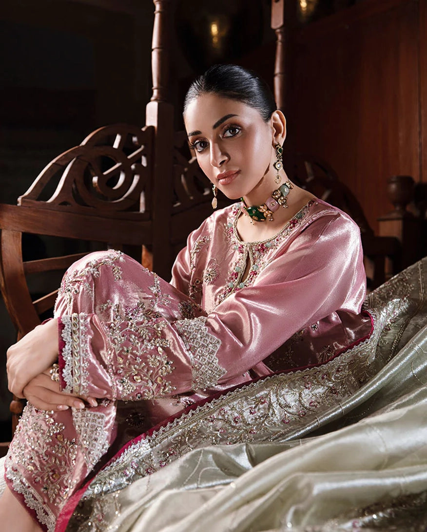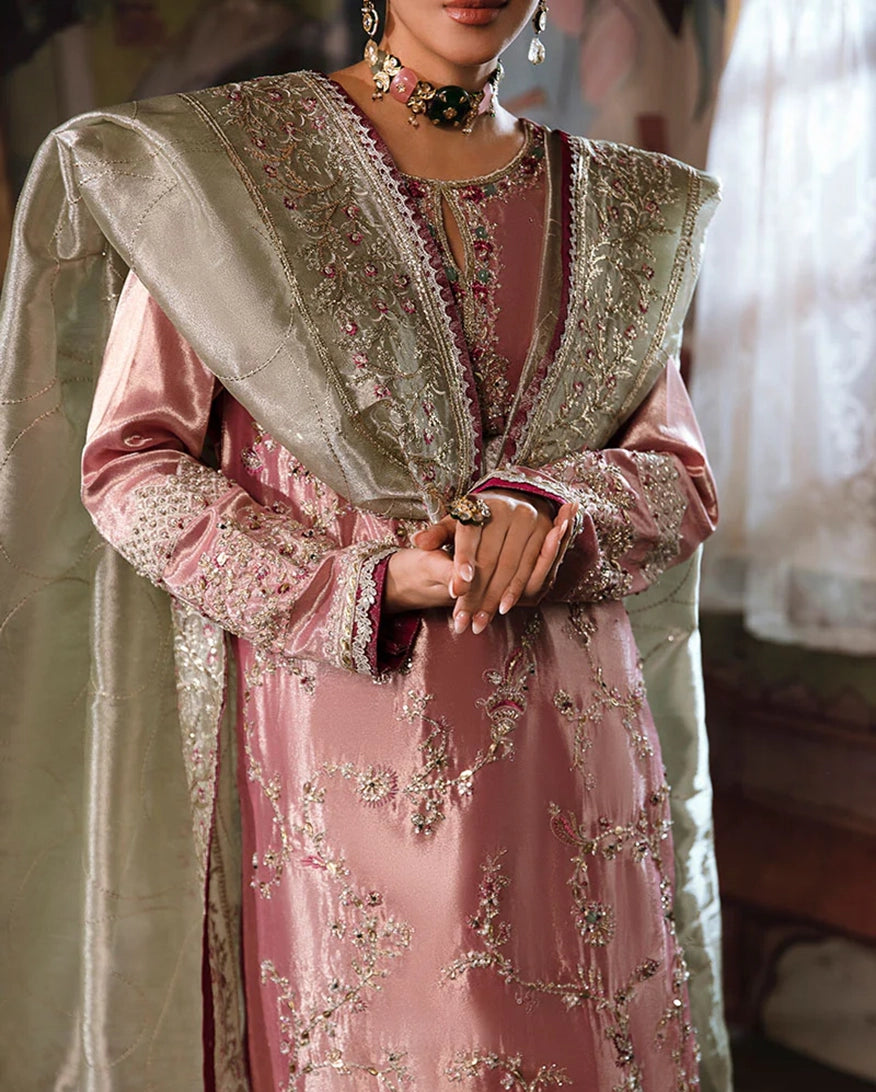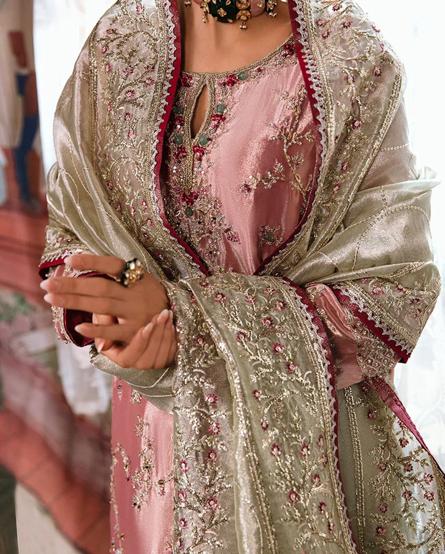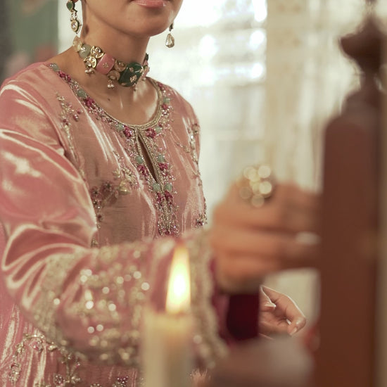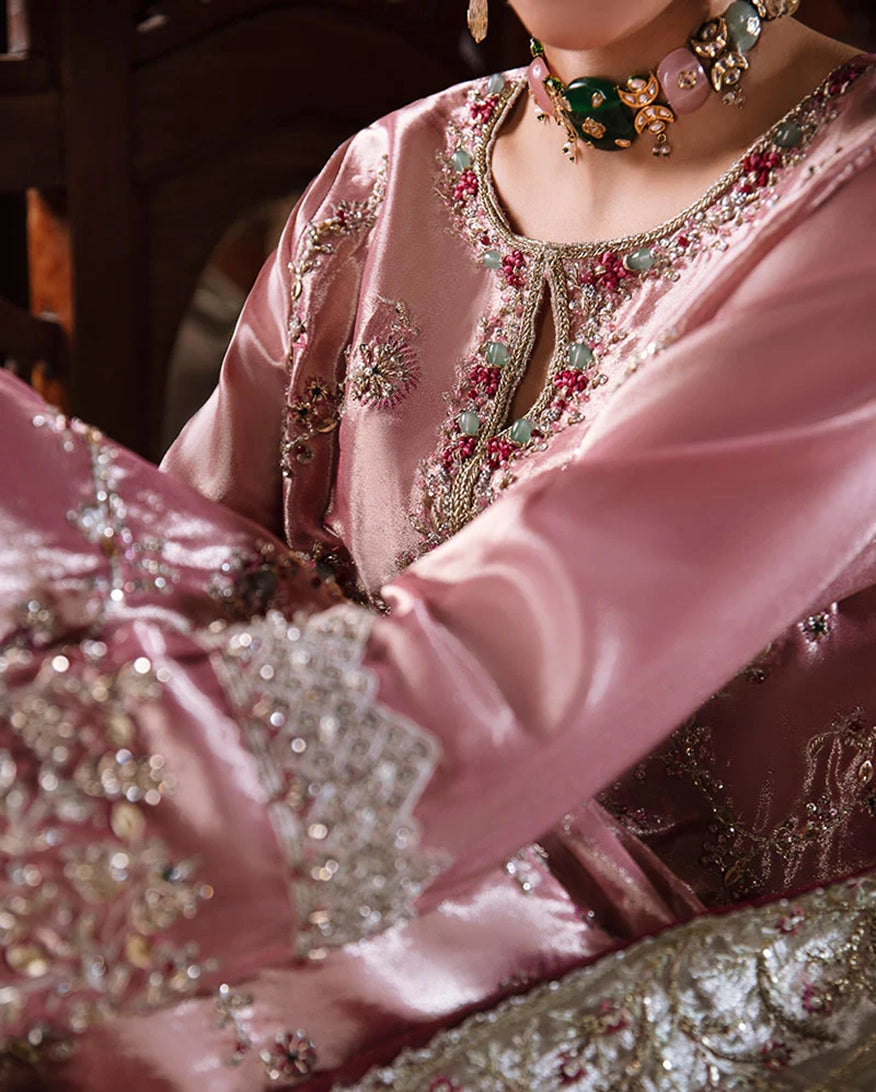Elegance personified in pink silk: this enchanting ensemble features exquisite hand-embellished details. Delicate embroidery, adorned with fine beads and embellished details, graces the fabric, imparting a touch of ethereal charm and timeless grace to this captivating