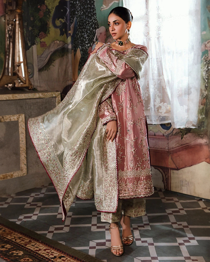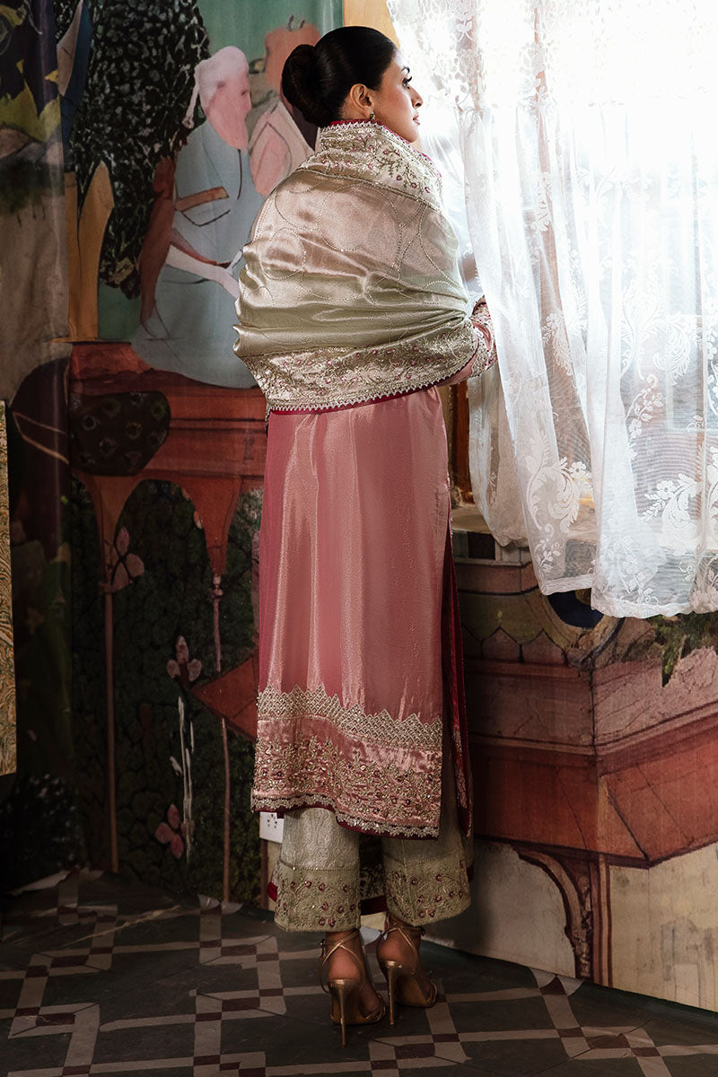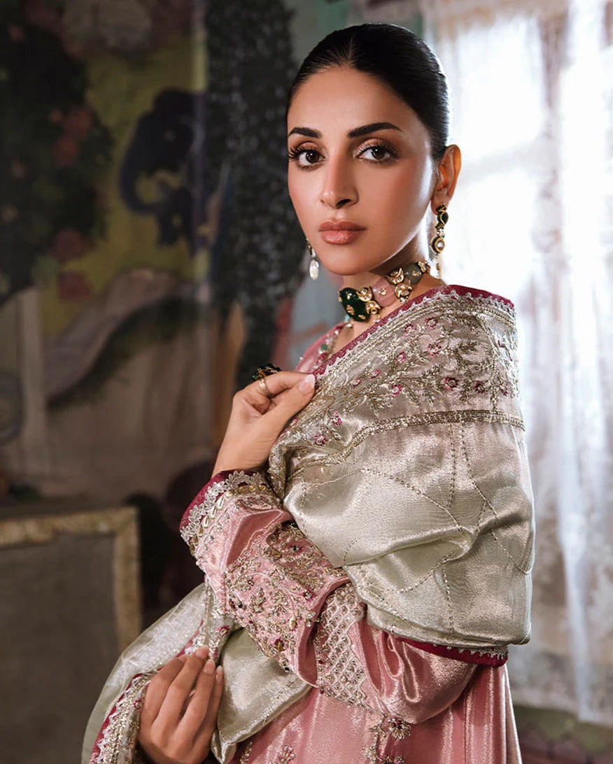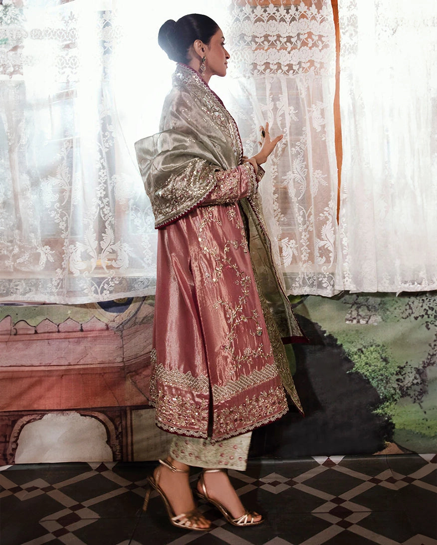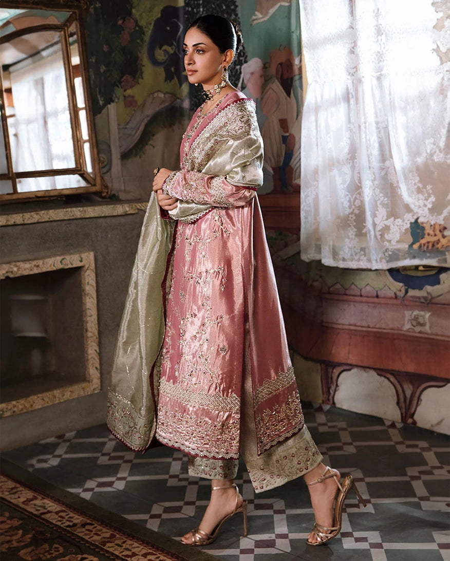 Elegance personified in pink silk: this enchanting ensemble features exquisite hand-embellished details. Delicate embroidery, adorned with fine beads and embellished details, graces the fabric, imparting a touch of ethereal charm and timeless grace to this captivating