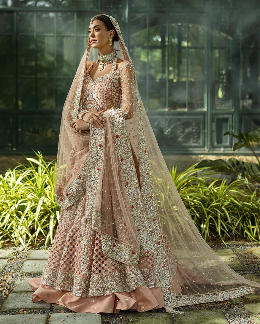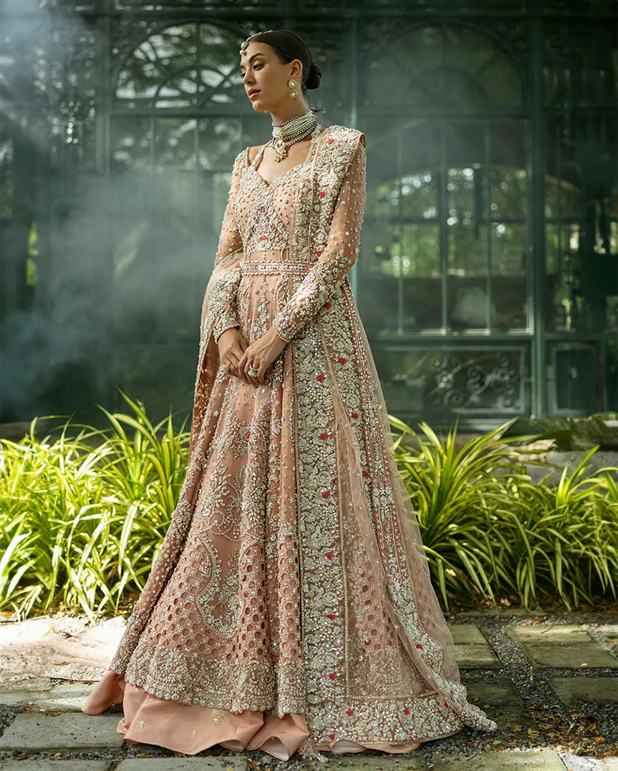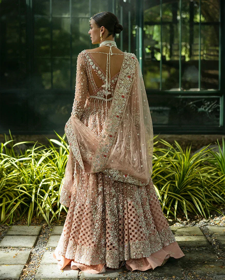 Timeless elegance in peach. A net shirt with intricate dabka, naqshi, and Swarovski crystals, paired with a raw silk lehenga featuring delicate tilla and sequence work. Finished with tassels on the neckline and dupatta.