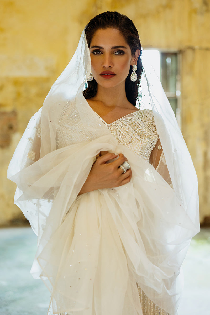 A symphony of elegance and opulence. This stunning design features a meticulously embroidered net shirt, complemented by luxurious raw silk trousers. Paired with a diaphanous organza dupatta adorned with intricate embellishments. The perfect choice for making a bold yet graceful statement this season.
