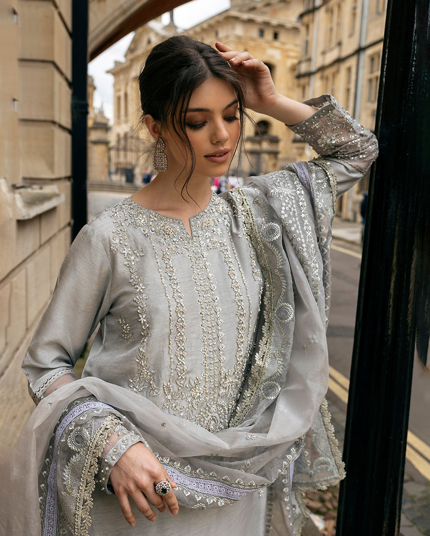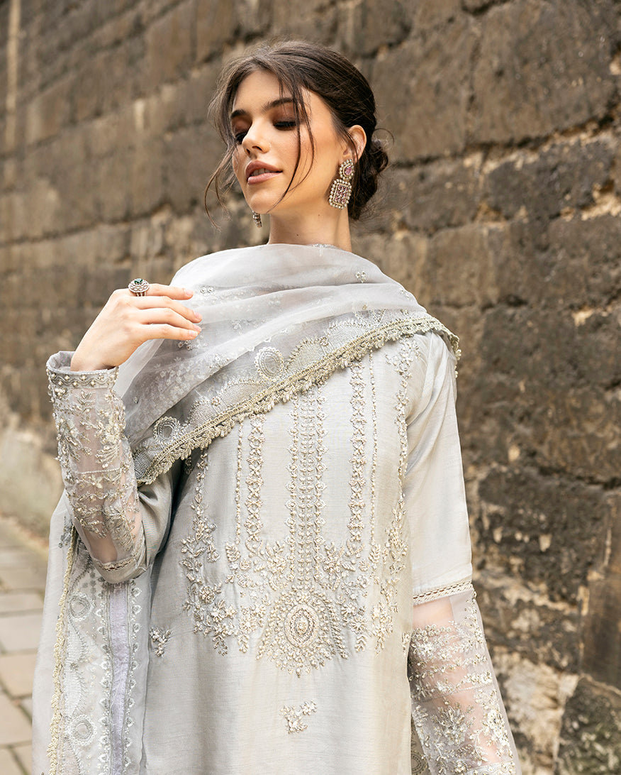 Indulge in luxury with this shirt featuring pure resham embroidery, hand-embellished with Swarovski crystals, tilla, dabka, and naqshi gemstones. The shirt is elegantly finished with laces on the daman and hem, while the pants are enhanced with embroidered borders. The look is completed with a diagonal color-blocked design and a sequins-embellished border, framed by a four-sided silk embroidery for a touch of sophistication.