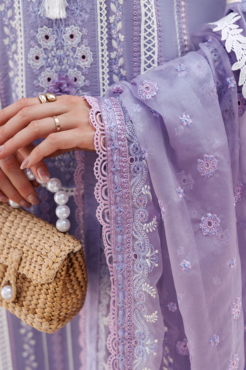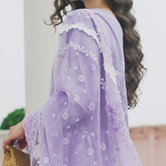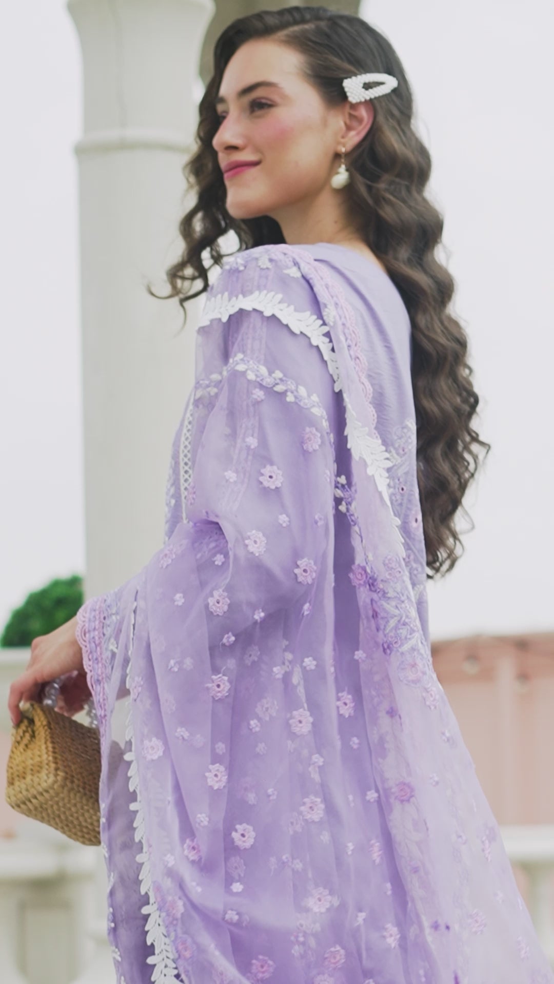 Step into ethereal elegance with our Luxe Candy Lilac ensemble. Adorned with intricate embroidered details including tassels along the neckline and paired with a beautiful organza dupatta adorned with fancy detailing. The delicate ensemble seamlessly exudes effortless grace.