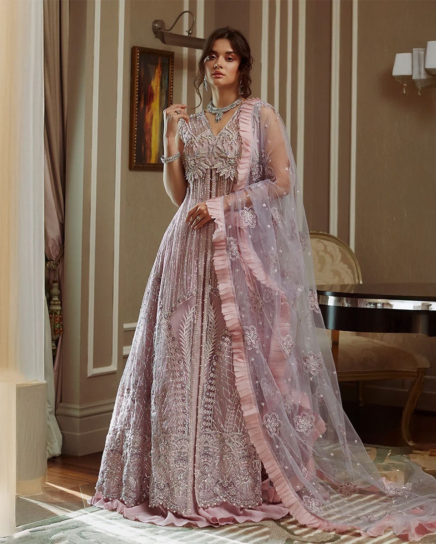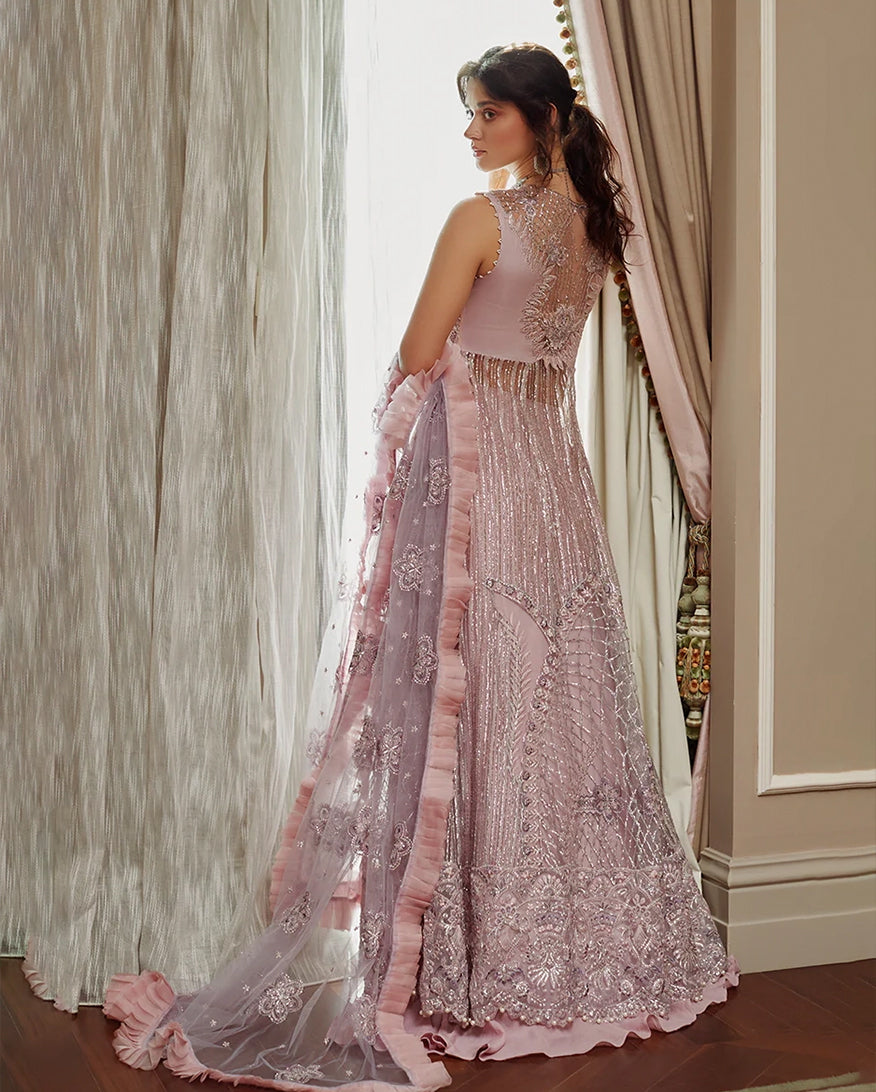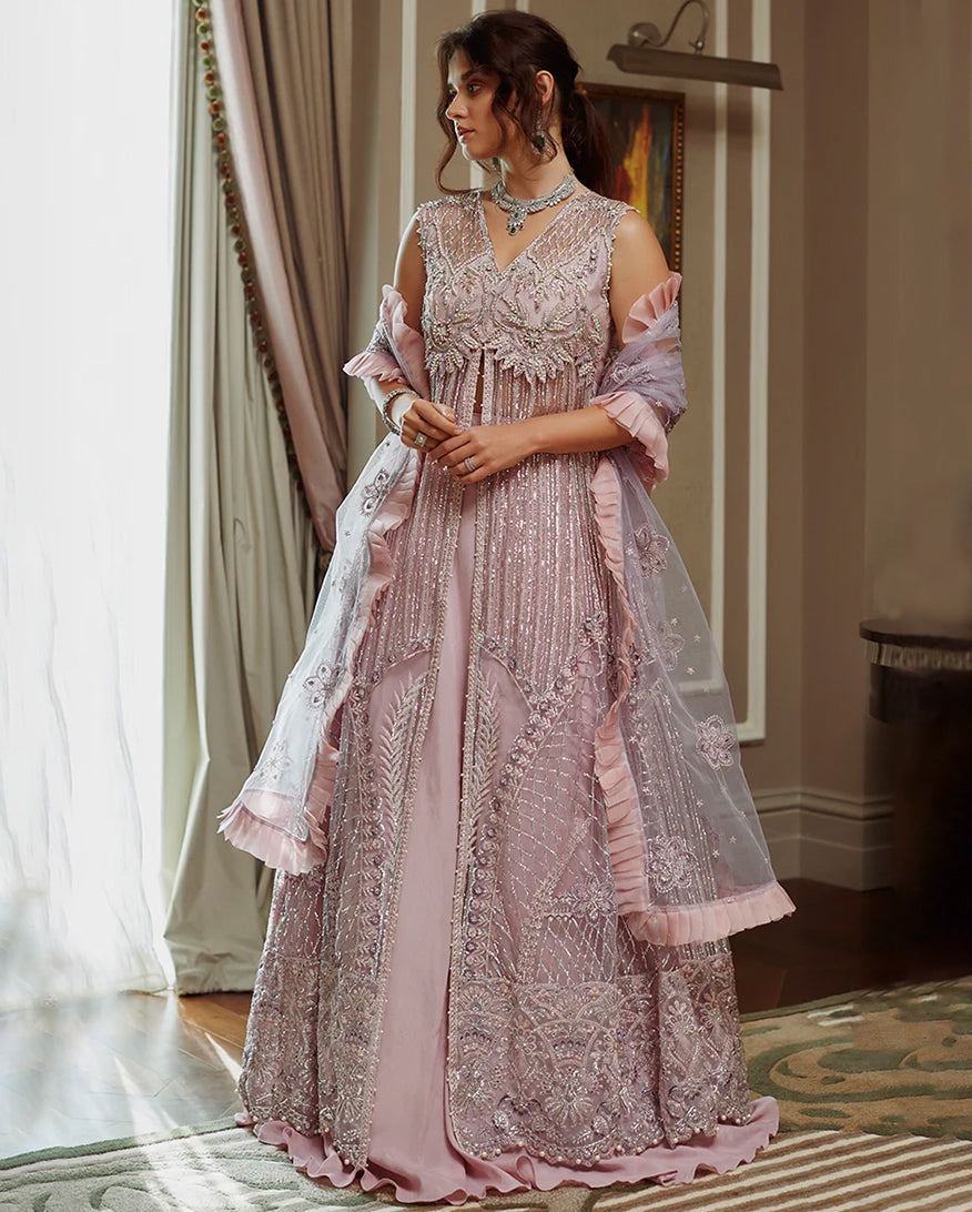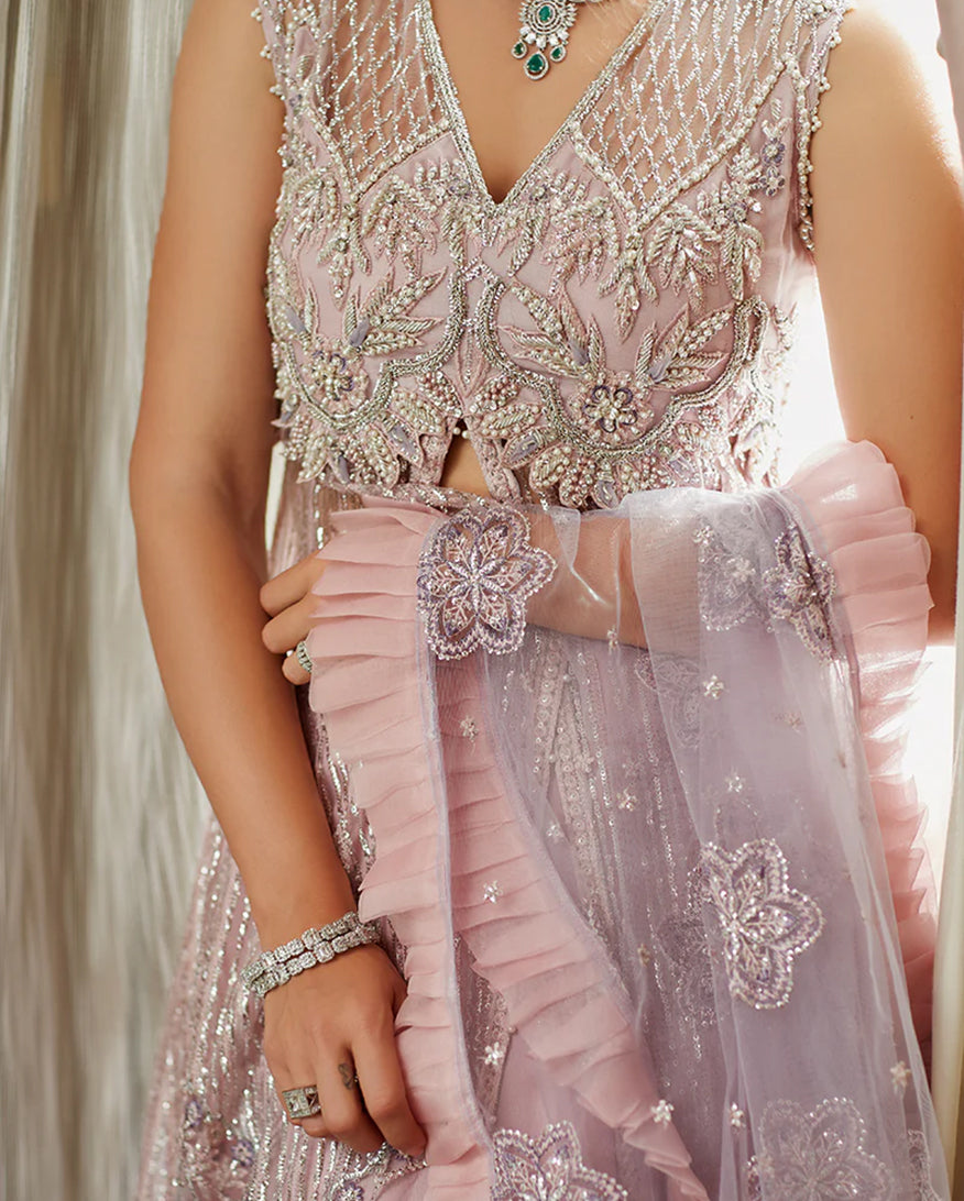 -Embroidered and sequinned sleeves net Embroidered, sequinned and pearl embellished back daman border organza