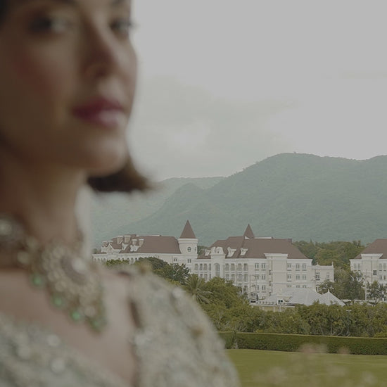 A symphony of romance in aqua green, Marcyln blooms with elegance. This delicate net lehenga-choli sparkles with dapka, naqshi, pearls, and Swarovski crystals, capturing the joy of a bride’s journey. With tassels and a pearl-sprayed back option, Marcyln is crafted to celebrate her love and the beginning of forever.