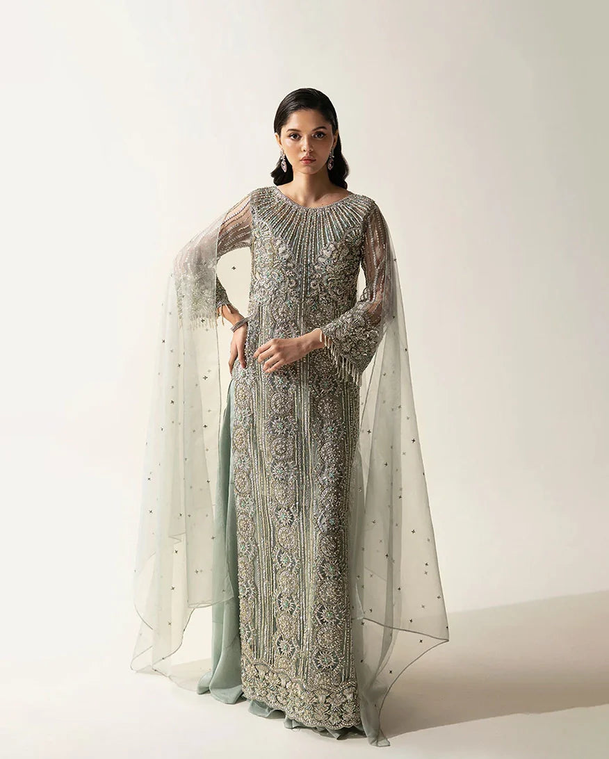 Crafted from delicate net fabric, Meline is adorned with a meticulous arrangement of pearls, crystals, dabka embroidery, moti beads, and modern pipe detailing. The delicate interplay of these elements on the sheer net canvas creates a mesmerizing visual tapestry