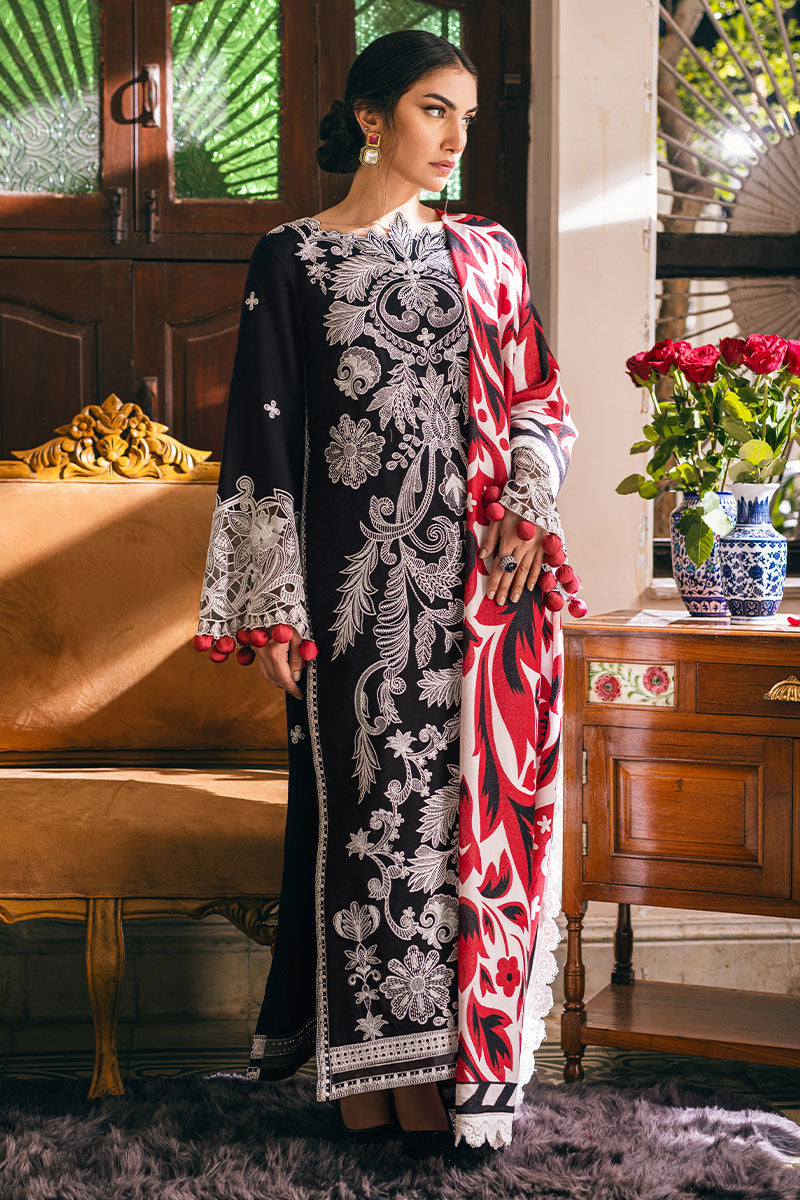 Experience the allure of autumn with our Midnight Magic ensemble in striking black. The embroidered karandi front and vibrant red printed shawl create a captivating contrast, perfect for those enchanting fall evenings. Let the magic of the season inspire your style!