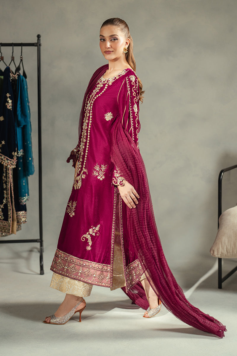 'Mira' ensemble includes a velvet shirt paired with jamawar bottoms and an organza dupatta. Adorned with pearls, bethki, crystals, resham, naqshi, dabka, kora, and sequins, it showcases exquisite craftsmanship. The multi-head embroidery enhances the look with intricate and vibrant detailing.