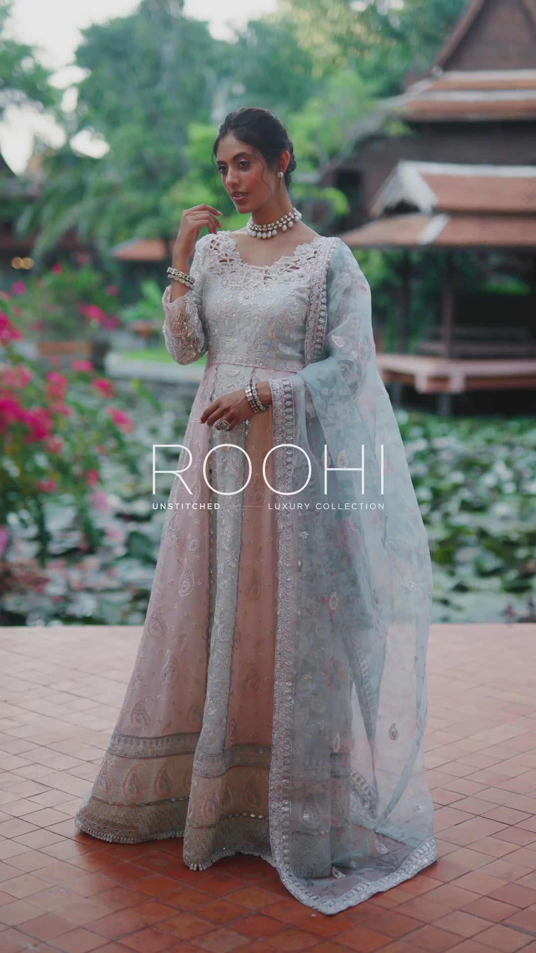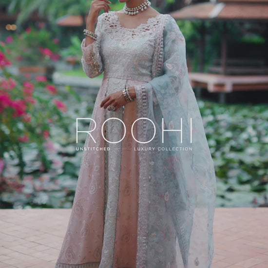 Misha exudes elegance with its meticulously embroidered and sequinned front, back, and sleeves, complemented by luxurious organza lace details. Featuring a beautifully printed organza dupatta and a blend of cotton silk and raw silk for a sophisticated finish, this ensemble is elevated with hand-embellished tassels and intricate mirror and crochet accents.