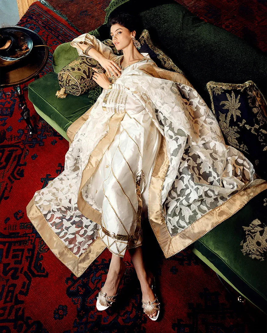 Radiating elegance in white, "Moti" is crafted from luxurious raw silk. A timeless design that embodies grace and sophistication.