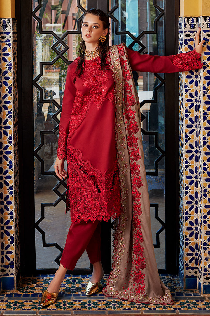 A striking shade of red, where passion meets elegance. This exquisite outfit is a celebration of bold femininity, with intricate red embroidered details gracing both the shirt and the luxurious brown shawl. Prepare to captivate hearts and turn heads in this ensemble that embodies timeless charm and contemporary style.