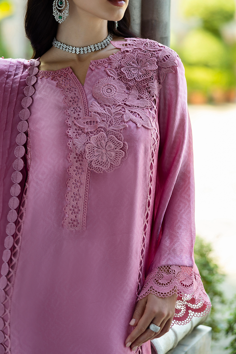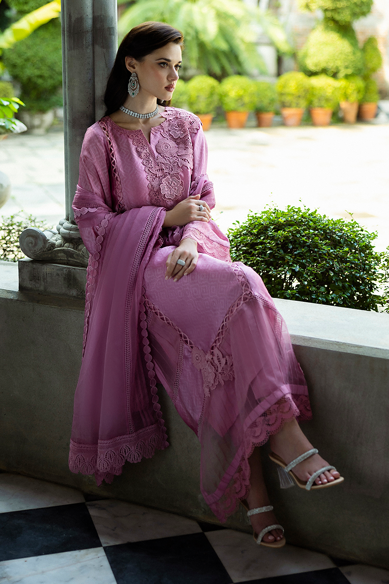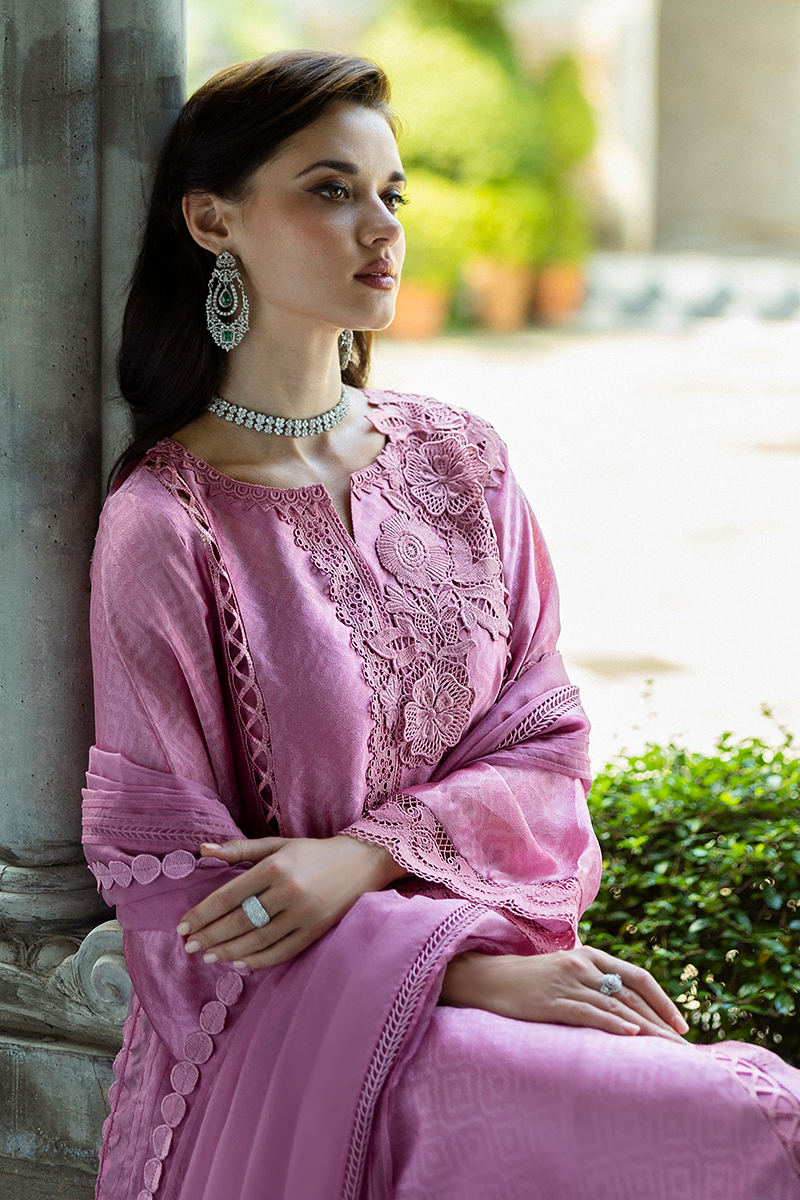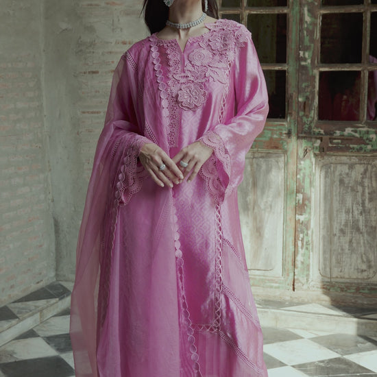Nate - the epitome of feminine elegance. Rendered in a delicate pink hue, this ensemble exudes a timeless charm, perfect for Eid celebrations. The jacquard fabric shirt is adorned with intricate detailing, creating a luxurious and refined look. A flowing BM organza dupatta adds a touch of ethereal grace, complementing the ensemble beautifully. Raw silk trousers offer a structured yet elegant silhouette, ensuring both style and comfort. Lined with a silk inner, providing a seamless drape and a luxurious feel.