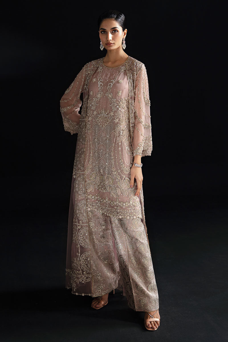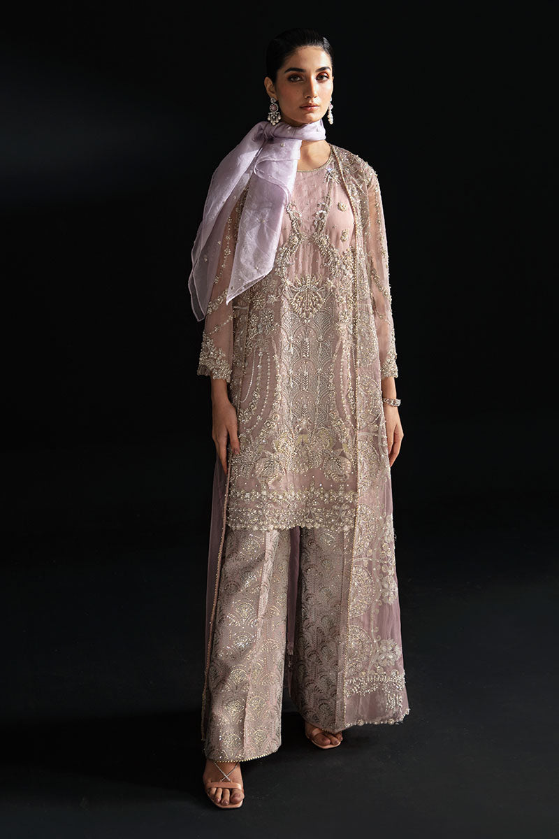 Crafted from the sheer elegance of organza fabric in a captivating lavender hue, Naya is adorned with an exquisite array of embellishments. Meticulously handcrafted dabka and naqshi embroidery, delicately woven chains, lustrous pearls, and the brilliance of crystals and swarovski elements converge to create a masterpiece that radiates sophistication.