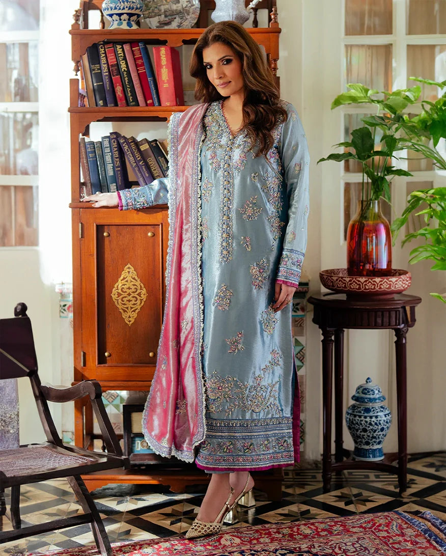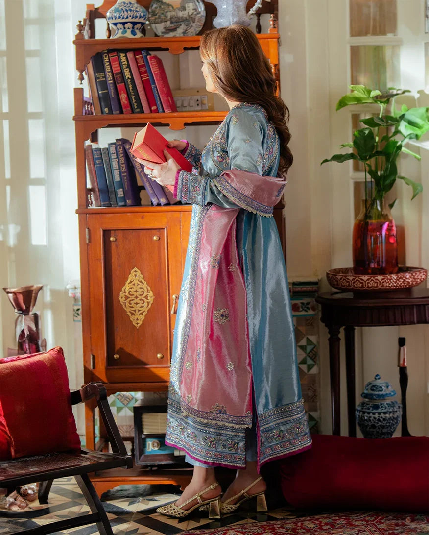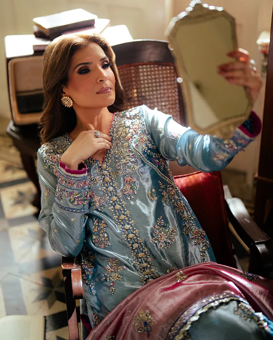 Neelam - a true masterpiece of elegance. The satin zari fabric shirt is beautifully adorned with intricate embroidery and embellishments, offering a rich and luxurious appeal. Paired with classic jamawar trousers and a graceful zari tissue dupatta, this ensemble is the epitome of timeless style. Neelam is designed to make every occasion truly unforgettable.