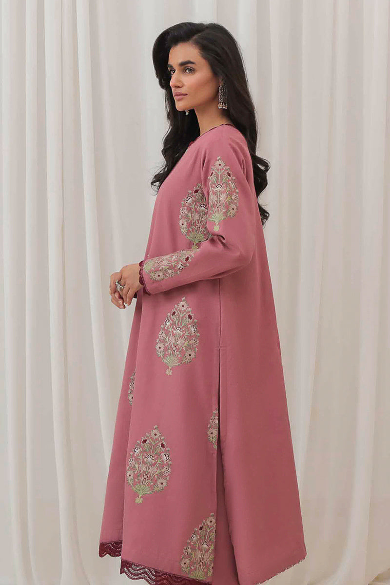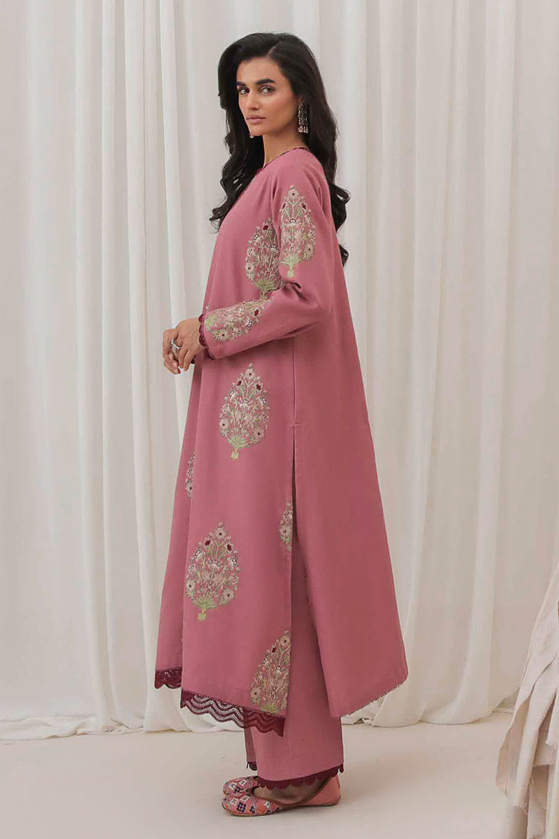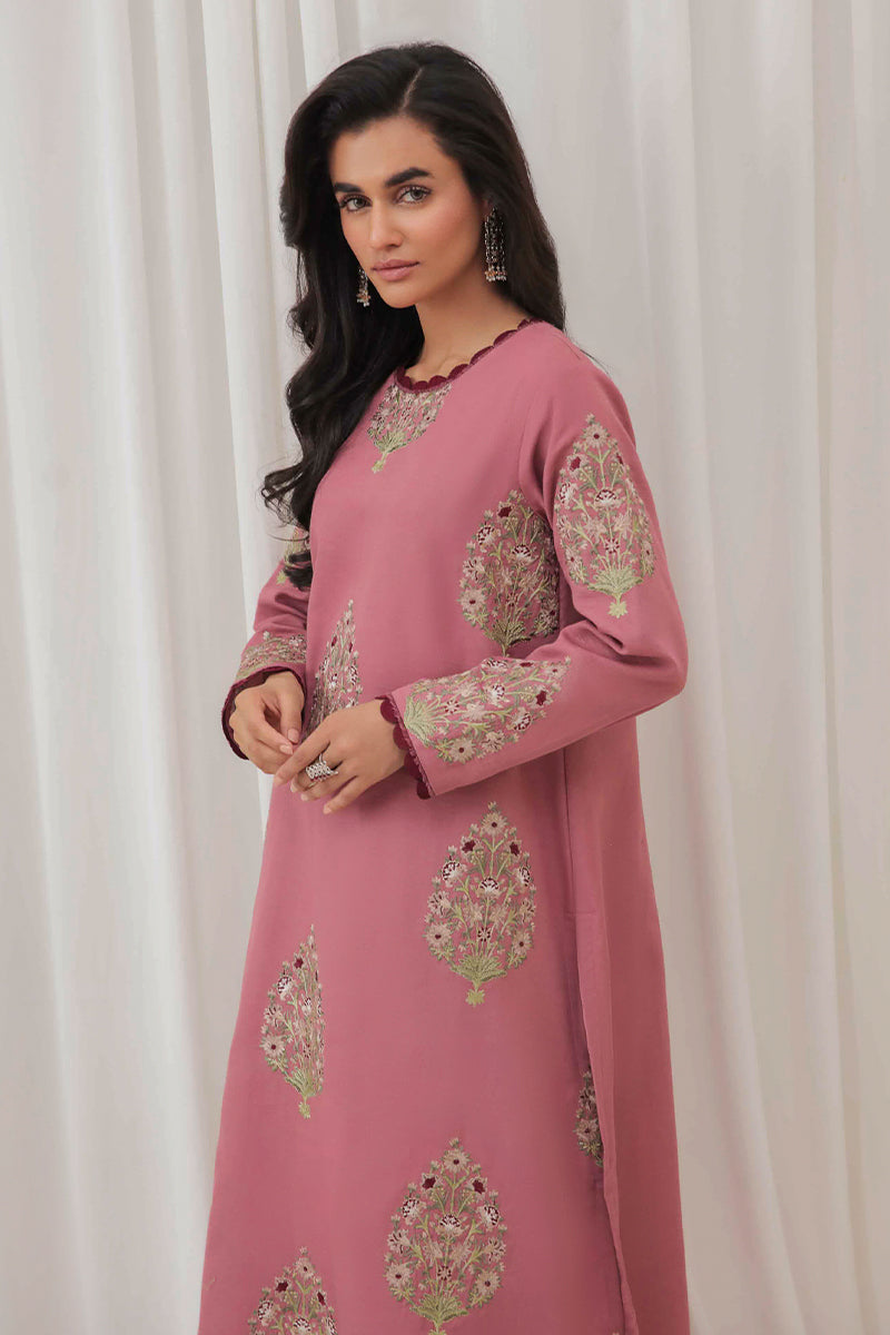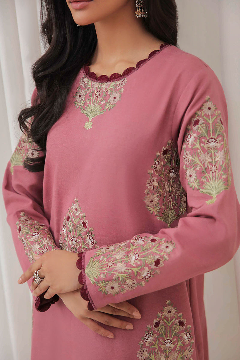 This chic pink khaddar ensemble is adorned with intricate embroidered motifs, adding a touch of elegance to its cozy texture. Perfect for making a statement this winter season!