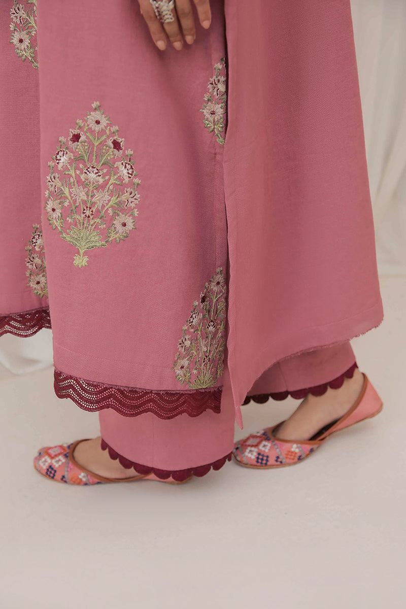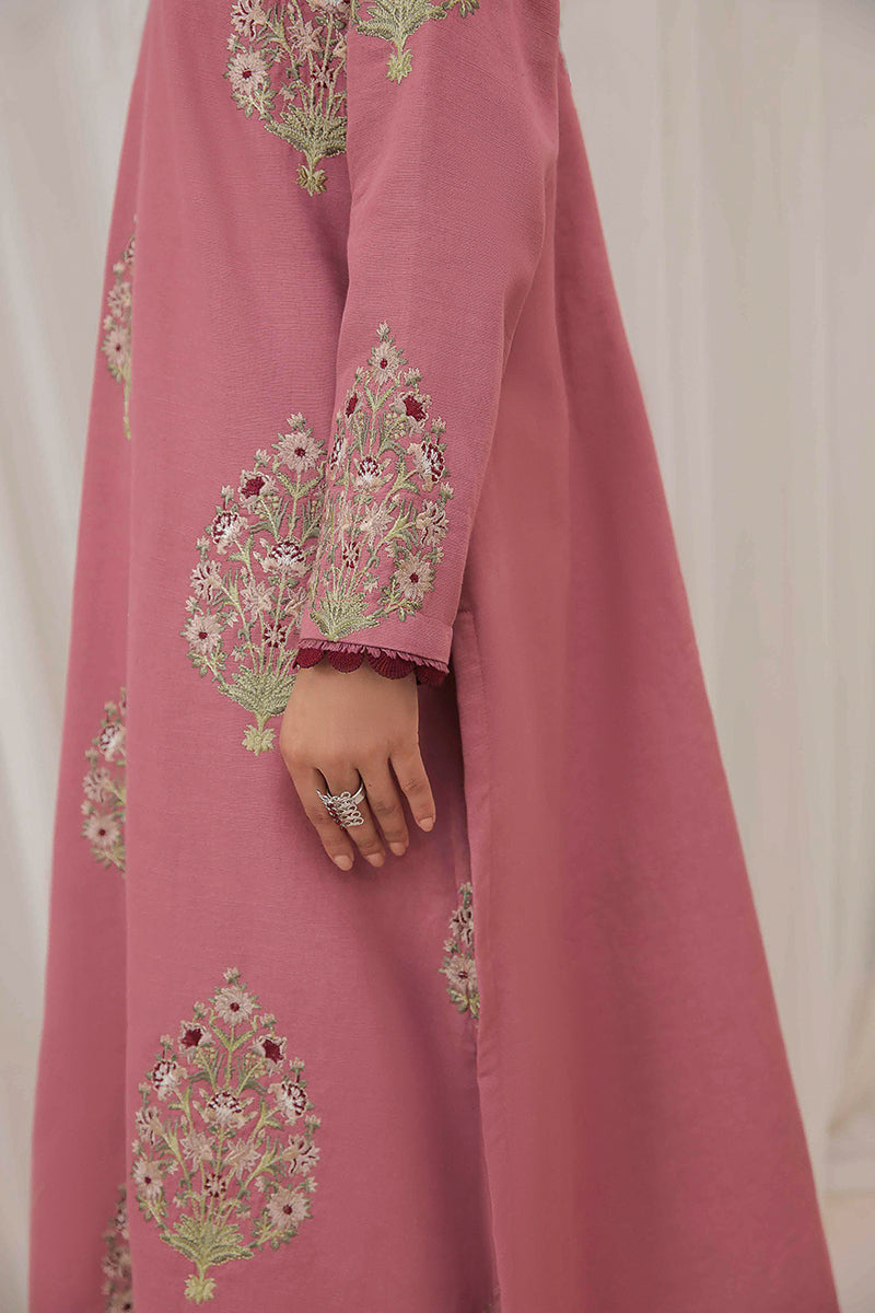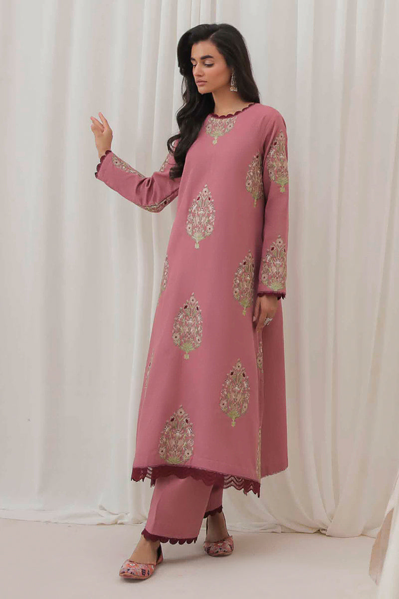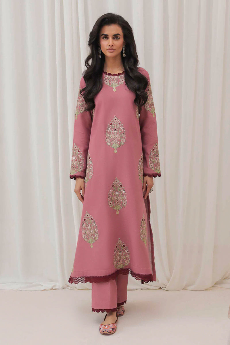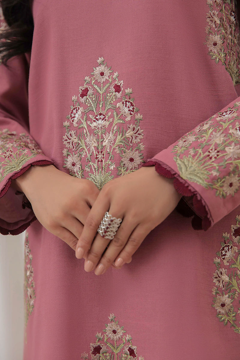 This chic pink khaddar ensemble is adorned with intricate embroidered motifs, adding a touch of elegance to its cozy texture. Perfect for making a statement this winter season!