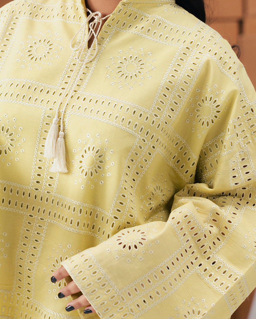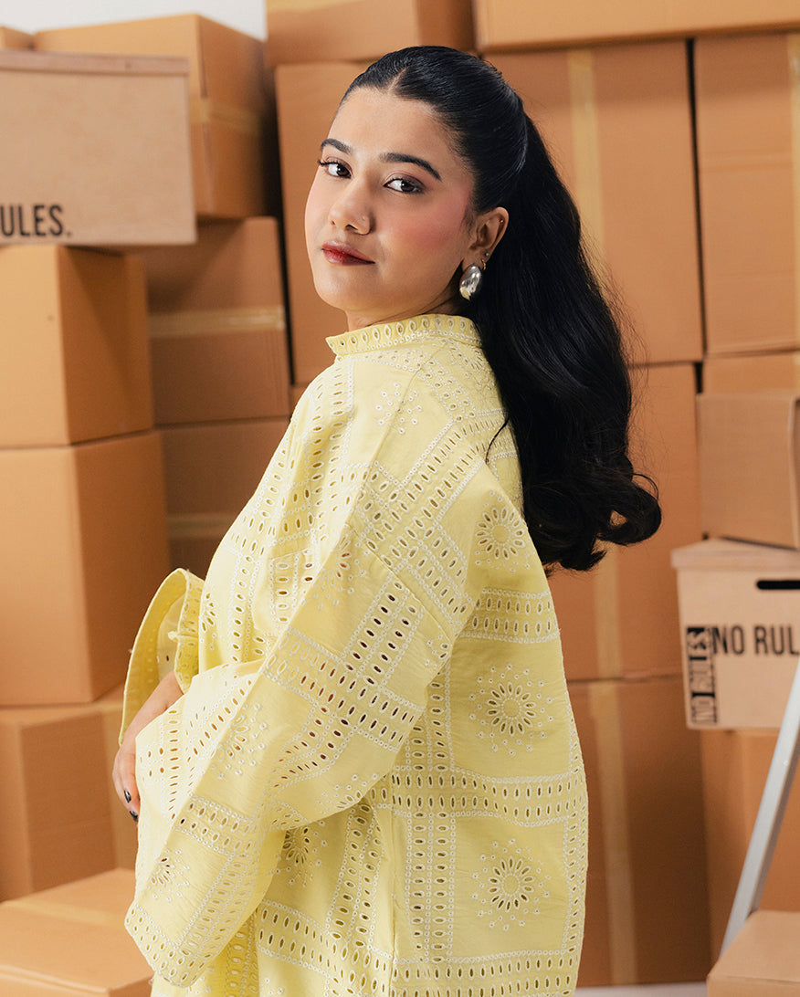 The Rebel Rhythm ensemble features a vibrant lime yellow cotton embroidered shirt adorned with intricate detailing along the neckline and sleeves. Paired with dyed cotton trousers, the look blends bold color with refined craftsmanship for a striking and polished silhouette.