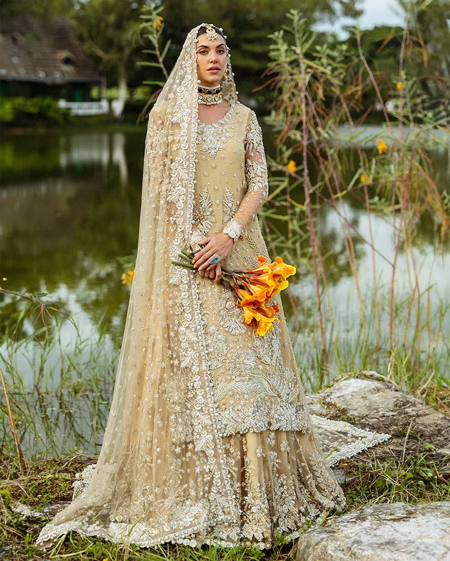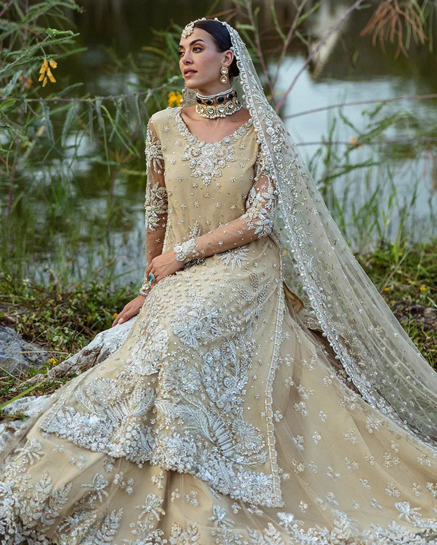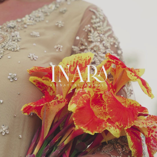 Subtle yet stunning. The beige net shirt with dabka, naqshi, and Swarovski crystals is a true masterpiece, finished off with a beautiful dupatta adorned with pearls and tilla balls. Perfect for the bride who loves a blend of tradition and modern luxury.