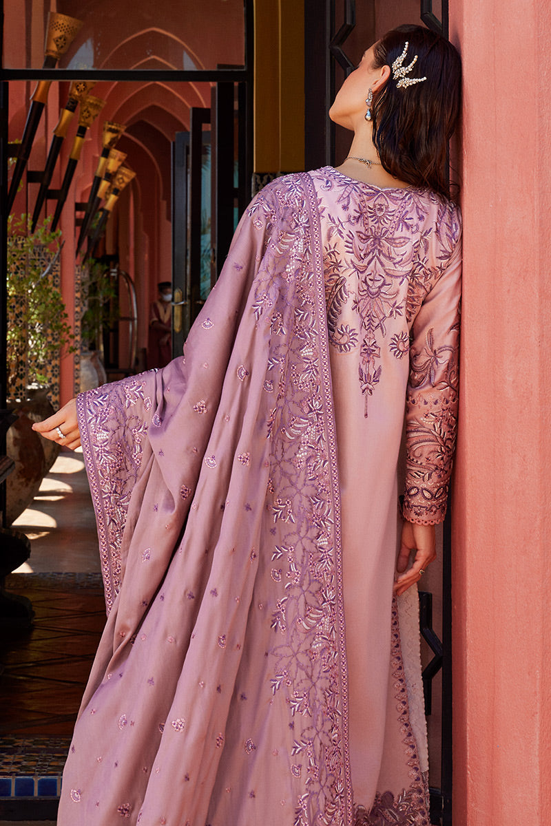 Exude ethereal delight in a soft and alluring shade of tea pink, where grace meets sophistication. Envelop yourself in the gentle elegance of this outfit, adorned with intricate shades of lilac embroidered details, creating a mesmerizing ensemble that captures the essence of feminine charm.